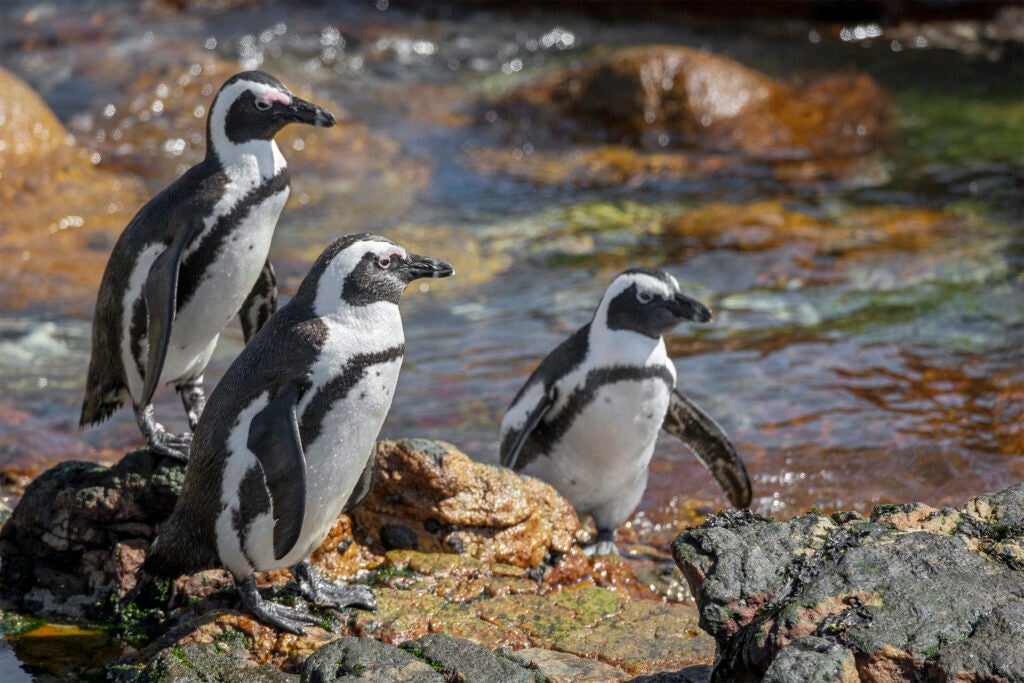 All penguins live in the Southern Hemisphere. Most inhabit temperate oceans and coasts like we have in California. In southern Africa, African penguins Spheniscus demersus live on coastlines and offshore islands. Here, the Benguela current flows northward along the west coast of South Africa and Namibia, where its cold, nutrient-rich water promotes phytoplankton blooms that support large schools of sardines and anchovies, which in turn support African penguins’ high-energy lifestyle.