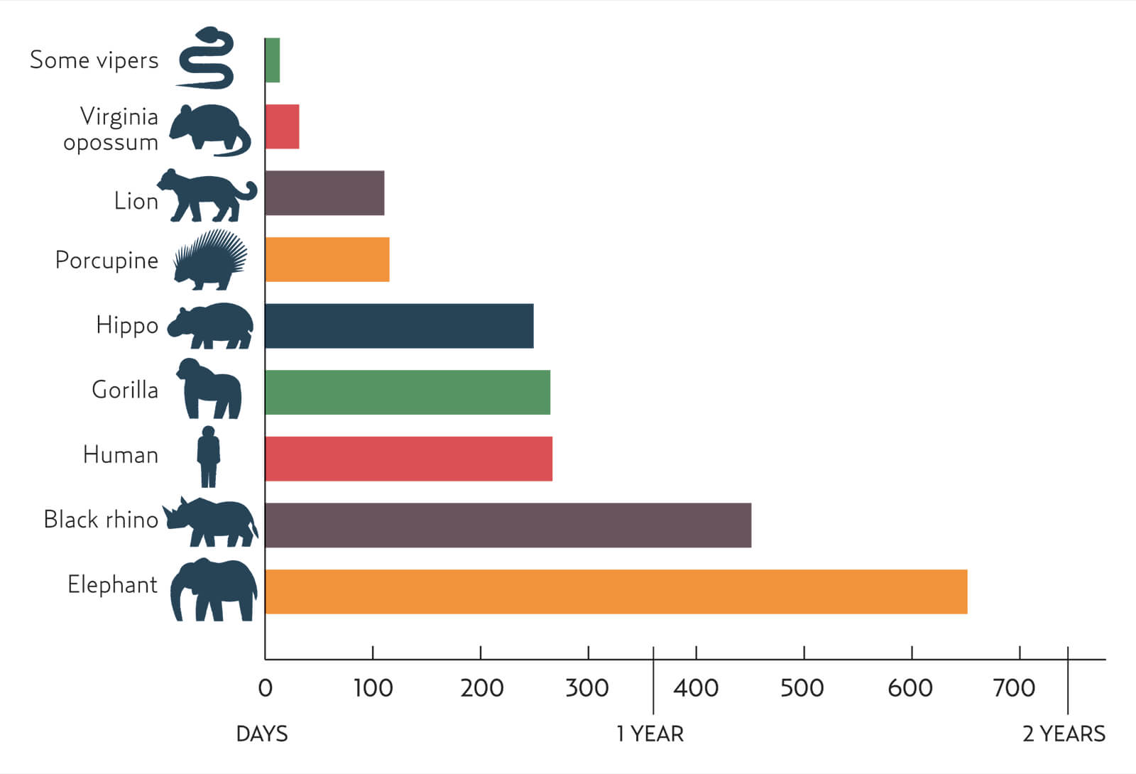 With a gestation of only 13 days, the Virginia opossum wins the reproduction race among mammals. With avian eggs, some small passerines are the early birds, incubating a mere 11 days. Here’s a look at how long it takes some other animals to produce offspring.
