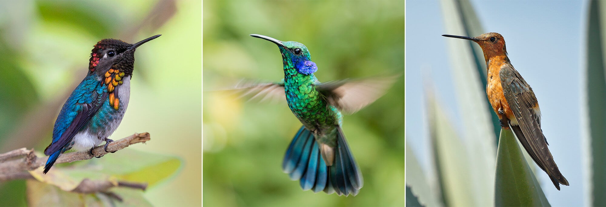 The 300-plus species of hummingbird are found only in the Americas. Some live in the high altitudes of the Andes Mountains, where they encounter frost and snowfall. When it’s especially cold, the birds go into deep torpor, which means their body temperature lowers and metabolism slows to conserve energy. In torpor, they appear completely asleep. Other species are found in cool and dry grasslands, forest lowlands, tropical rainforests, and even deserts. Many hummingbirds routinely migrate 500 miles (805 kilometers) or more every year. The rufous hummingbird Selasphorus rufus migrates an impressive 3,000 miles (4,828 kilometers) from Mexico to Alaska, where it breeds during the summer.