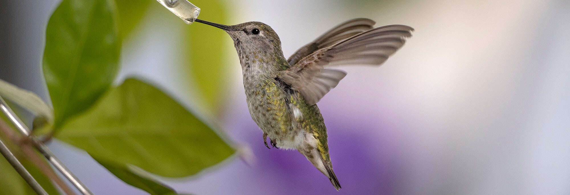 Hummingbird bills are also well suited for specific needs. Long and slender, the bill is adapted to collect nectar from flowers. It protects the bird’s long, split tongue and enables each kind of hummingbird to feed from specific types of flowers. Hummingbirds are nectivores—about 90 percent of their diet is the nectar from flowers. And as anyone with a hummingbird feeder in their yard can attest, these little birds are frequent fliers—or diners. They are feeding a need—for fuel. Given their metabolism, it’s estimated that a hummingbird needs to eat every 15 minutes. Even though hummingbirds are small in size, they have a large appetite. They get plenty of exercise with all that zipping around just to get from sip to sip. These petite birds consume between 3.14 and 7.6 calories a day. And because they hover and sip, they keep beating their wings and burning calories even as they eat. Insects and spiders make up a smaller part of their diet. A hummingbird “hawks” insects by flying and diving to snap them out of the air.