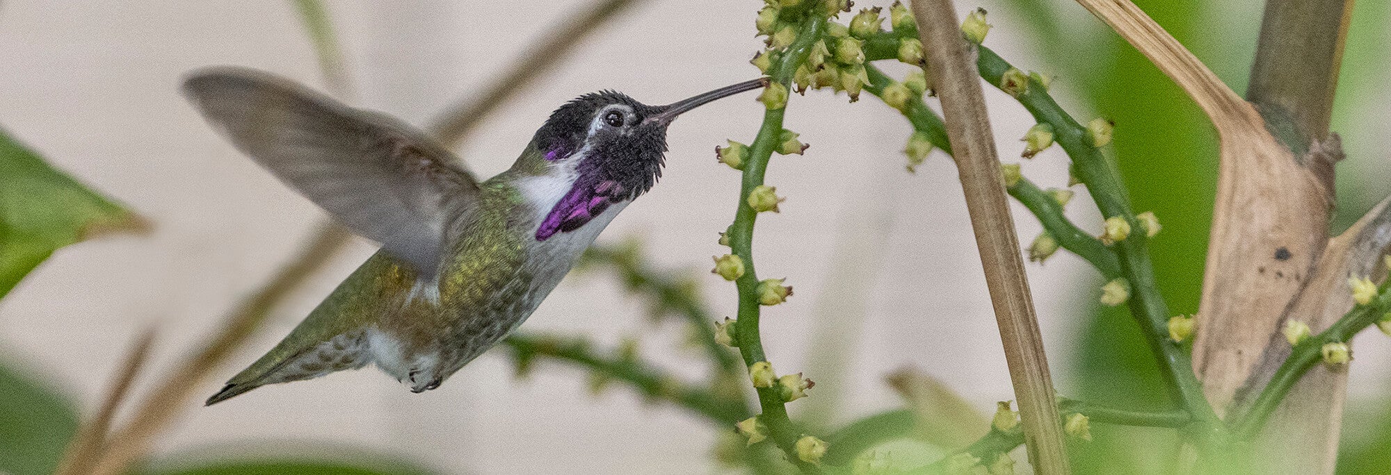 San Diego County is home to five hummingbird species: Anna’s Calypte anna, Allen’s Selasphorus sasin, black-chinned Archilochus alexandri, rufous Selasphorus rufus, and Costa’s Calypte costae. In the San Diego Zoo’s new William E. Cole Family Hummingbird Habitat, guests can observe Anna’s and Costa’s hummingbirds, along with emerald hummingbirds Amazilia amazilia, and other avian wonders. “This is, by far, the best habitat we have ever built for hummingbirds and other neotropical birds,” says Dave Rimlinger, curator of birds for San Diego Zoo Wildlife Alliance. And there will be nectar and pollen sources for all.