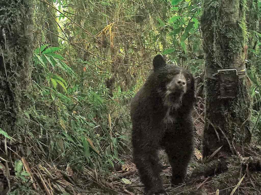 We don’t detect bears lower down, where there appear to be more diverse foods, supporting many more species of birds and primates than live at higher elevations. Why do the bears not descend the slopes to compete for these foods, fish in the large rivers, or forage around illegal gold-mining camps? We do not know yet, but we are analyzing more than 150,000 images of wildlife, including more than 45 species of mammals, to see if patterns suggest that landscape features or negative interactions with other species may keep Andean bears from the lowlands. If Andean bears’ distribution is restricted by interactions with other species, and climate change results in those species moving up the slopes, as tree species are already moving up the slopes, then the bear’s range may shrink even though the slopes remain covered with forest.