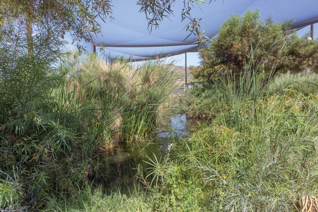 So, the most prized aviary at the Safari Park’s Bird Breeding Center became home to all the milky storks in North America. At 20,000 square feet and 30 feet high, with tall trees, grass, and natural ponds that are home to crayfish, the space encourages the birds to use natural behaviors like foraging live food from the ponds, gathering nesting materials, social displays, mate selection, and pair bonding. Rain is a breeding stimulus, and elevated sprinklers in the habitat provide “rainfall” when our sunny climate doesn’t. “It’s a little ecosystem,” says Jenny. “The birds take cues from the weather, the food availability, and everything in their environment. The abundant resources in this environment signal to them that it’s OK to breed.”