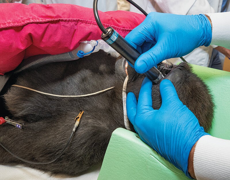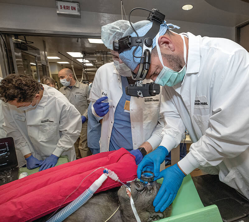 Dr. Heichel performed an ultrasound to rule out a tumor or a detached retina.[/caption] Leslie was too young to be separated from her mom, so the procedure had to involve Kokamo, too. “That increased everything exponentially,” says lead wildlife care specialist Peggy Sexton. The veterinary team immobilized both gorillas at the same time, so that mom and daughter could fall asleep together at the gorilla habitat and wake up together at the gorilla habitat. “I didn’t want mom to go to sleep before the baby did—and I didn’t want them to remember any of it, if possible,” Peggy says. Once the two gorillas were anesthetized, teams of wildlife care specialists, veterinarians, and vet technicians jumped into action, driving them to the Safari Park’s Paul Harter Veterinary Medical Center. They bathed Leslie and trimmed her nails—to reduce the chance of introducing bacteria in case she rubbed her eyes. Then they moved the little gorilla into a sterile surgery room, where Dr. Heichel could take his first good look at Leslie’s cataract, under a microscope, and measure her eye. [caption id="attachment_136072" align="aligncenter" width="800"]