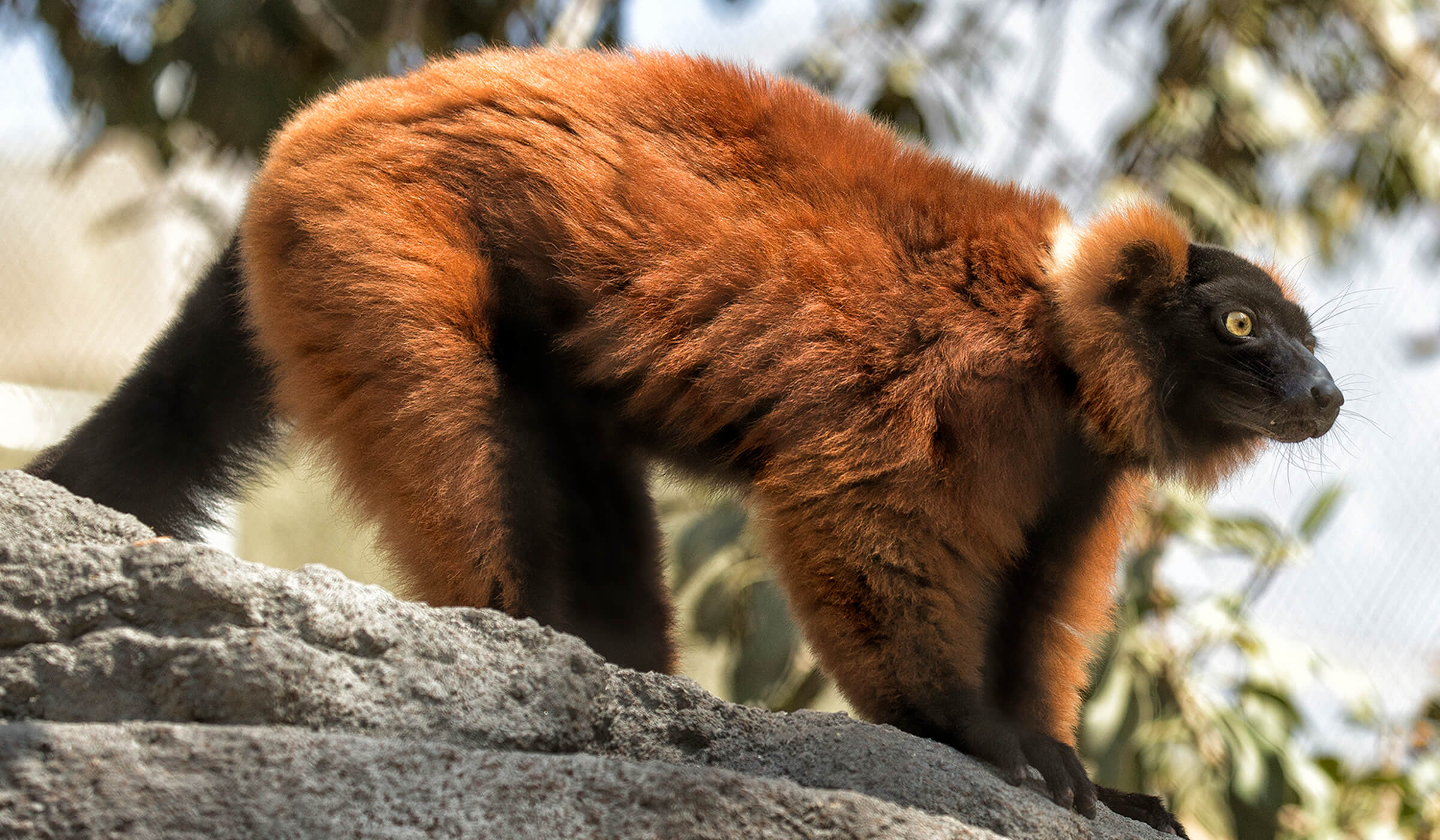 Leaping gracefully from tree to tree, golden eyes wide and watchful, the fluffy, flame-red lemurs are striking creatures to see in action. San Diego Zoo guests can observe—and hear—a raucous group of four red ruffed lemurs (sharing their habitat with a pair of blue-eyed black lemurs) in the Madagascar Forest area in Conrad Prebys Africa Rocks. This lemur species is unusual on several fronts, explained wildlife care specialist Yeleny Smith. “They are one of the few genera of lemurs that can have more than two offspring at a time, they are the most frugivorous, and they are the loudest,” she said. Red ruffed lemurs are not shy about communicating perceived danger and territory boundaries, and those calls can be heard over half a mile away. Red ruffed lemurs Morticia and Arche are the parents of two male offspring born in May 2019. The youngsters have Malagasy names: Mahitsy, meaning “crooked,” was named for the shape of his tail, while his robust brother was named Mahery, meaning “strong one.” Newborn red ruffed lemurs are tiny, helpless, and kitten-like. Yeleny said that Mahitsy was much weaker than his brother, and Morticia needed help caring for him, so staff intervened by providing nutritional support until he could feed on his own.