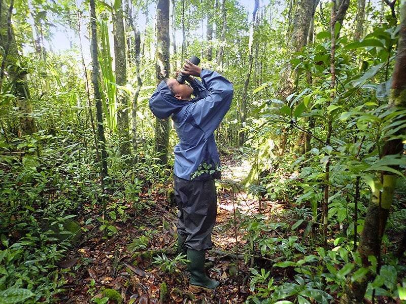 Volatiana, a researcher, is patiently scouring the remote rainforest canopy with binoculars for red ruffed lemurs in Masoala National Park. It can take several hours to find them in the forest. (Photo by Tim Eppley)[/caption] Once the lemur is measured, weighed, and given a health check, a 50-gram (about 2 ounces) collar is secured with a neoprene band. Within 90 minutes, the lemur is completely recovered from the anesthesia, and researchers return the animal to the point of collection and monitor it until it rejoins its core group. “The lemurs sometimes fiddle with the collar during the first few hours, but they soon forget all about it,” noted Tim. The collars provide data every 15 minutes, providing researchers an important glimpse into red ruffed lemur life.