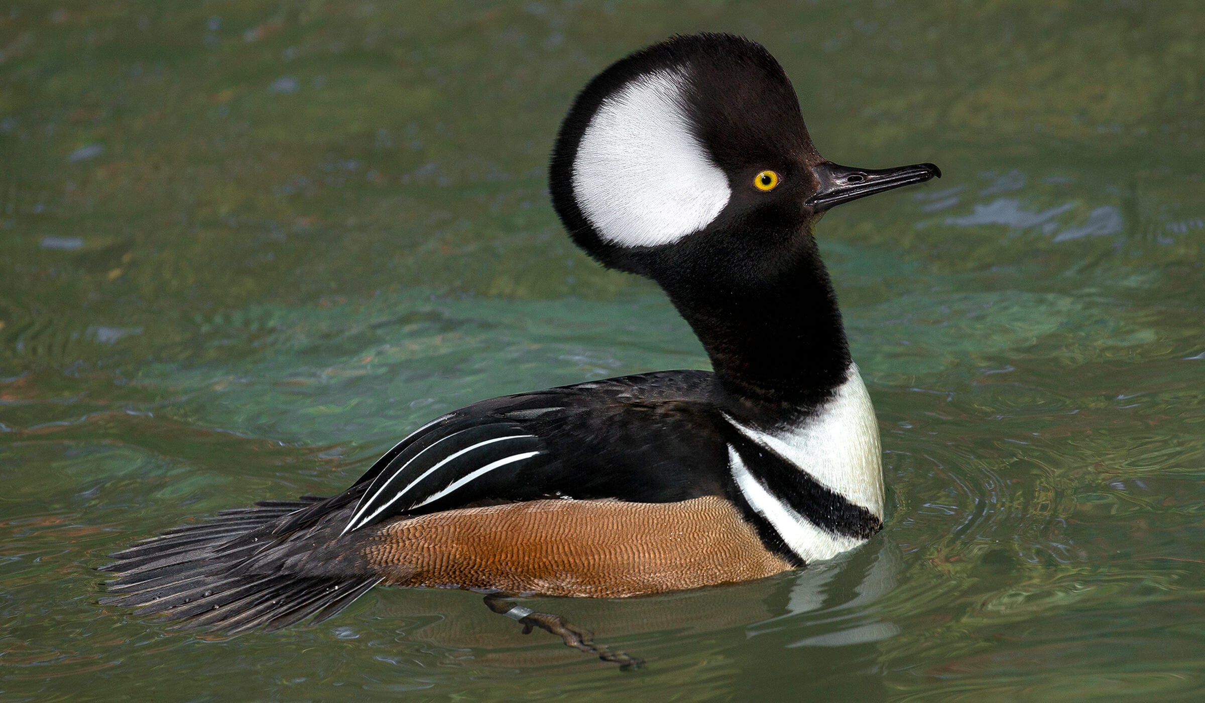HEAD TURNERDuring breeding season, the male hooded merganser expands its fan-shaped, collapsible crest to make its head look even larger—and makes deep, growl-like calls to attract females.[/caption]