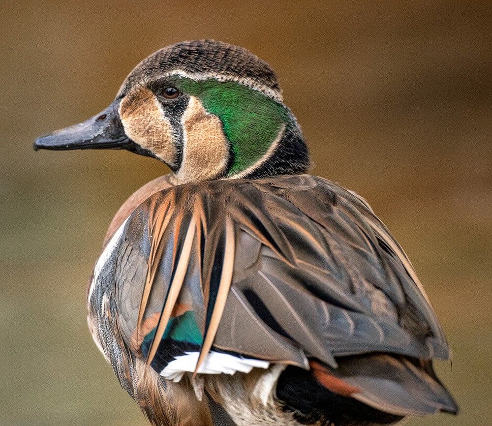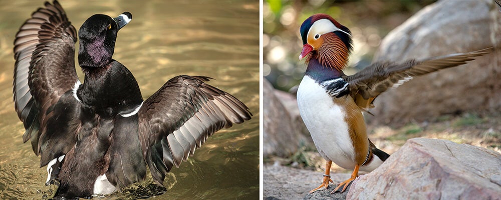 WINGING ITDiving ducks, like the ring-necked duck (left), have flatter, swept-back wings for high-speed flight over open water. Dabbling ducks, like the perching Mandarin duck (right), typically have large wings that allow for a quick takeoff from the water, but slower flight speed.[/caption] Males molt just before the breeding season, and emerge with plumage in bright colors to attract a mate. Most will pair bond for a season, but after the female lays her eggs, males do not stay around to raise chicks. Ducks are social and like company. “Most ducks not only hang out in groups of their own species, but associate with other species as well,” Dave said. “Ducks on a river are the exception, where one pair may ‘own’ and protect one section of the river.” [caption id="attachment_135318" align="aligncenter" width="2400"]