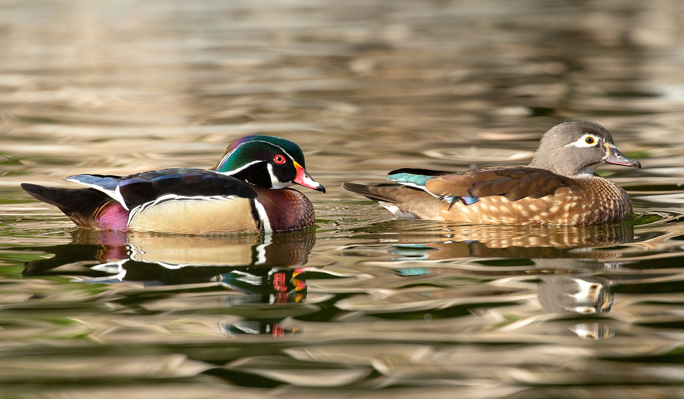 Diving ducks, like the ring-necked duck (left), have flatter, swept-back wings for high-speed flight over open water. Dabbling ducks, like the perching Mandarin duck (right), typically have large wings that allow for a quick takeoff from the water, but slower flight speed.[/caption] Males molt just before the breeding season, and emerge with plumage in bright colors to attract a mate. Most will pair bond for a season, but after the female lays her eggs, males do not stay around to raise chicks. Ducks are social and like company. “Most ducks not only hang out in groups of their own species, but associate with other species as well,” Dave said. “Ducks on a river are the exception, where one pair may ‘own’ and protect one section of the river.” [caption id="attachment_135318" align="aligncenter" width="2400"]