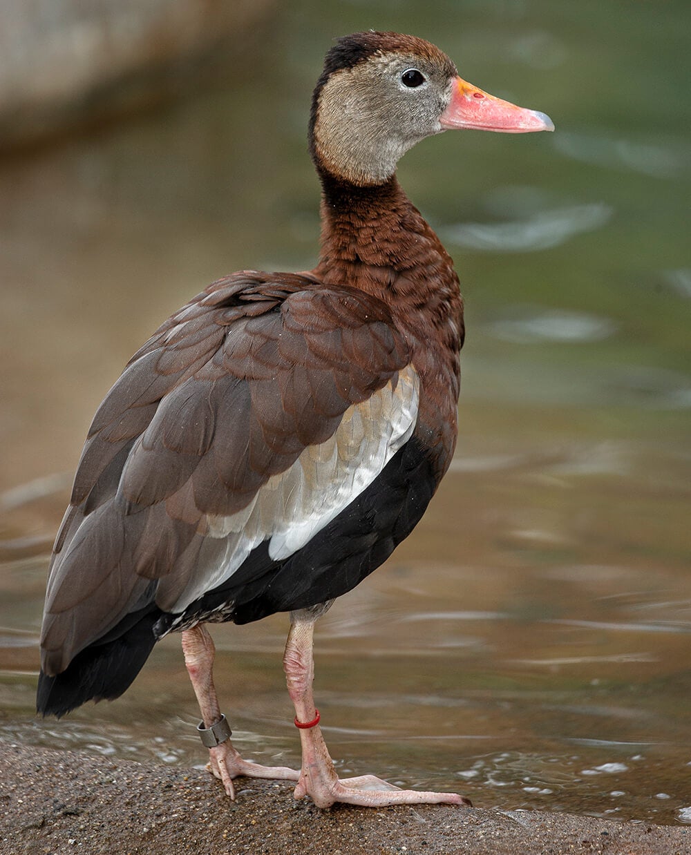 Both male and female black-bellied whistling ducks have the same distinctive pink-to-orange bills and feet—an example of a species that does not exhibit sexual dimorphism.[/caption] While there are more than 100 duck species worldwide, most share a few easily recognizable characteristics, including bills, webbed feet, and the ability to remain buoyant on the water’s surface. Ducks swim at an average speed of two to three miles per hour, but they can easily put on a burst of speed when necessary, propelled by powerful leg muscles, with webbed feet fully spread for maximum thrust. Further helping ducks stay afloat are internal air sacs that extend from their lungs into their body cavity, and a layer of down below their external feathers that traps air for buoyancy and provides insulation against temperature extremes. [caption id="attachment_135307" align="aligncenter" width="2400"]