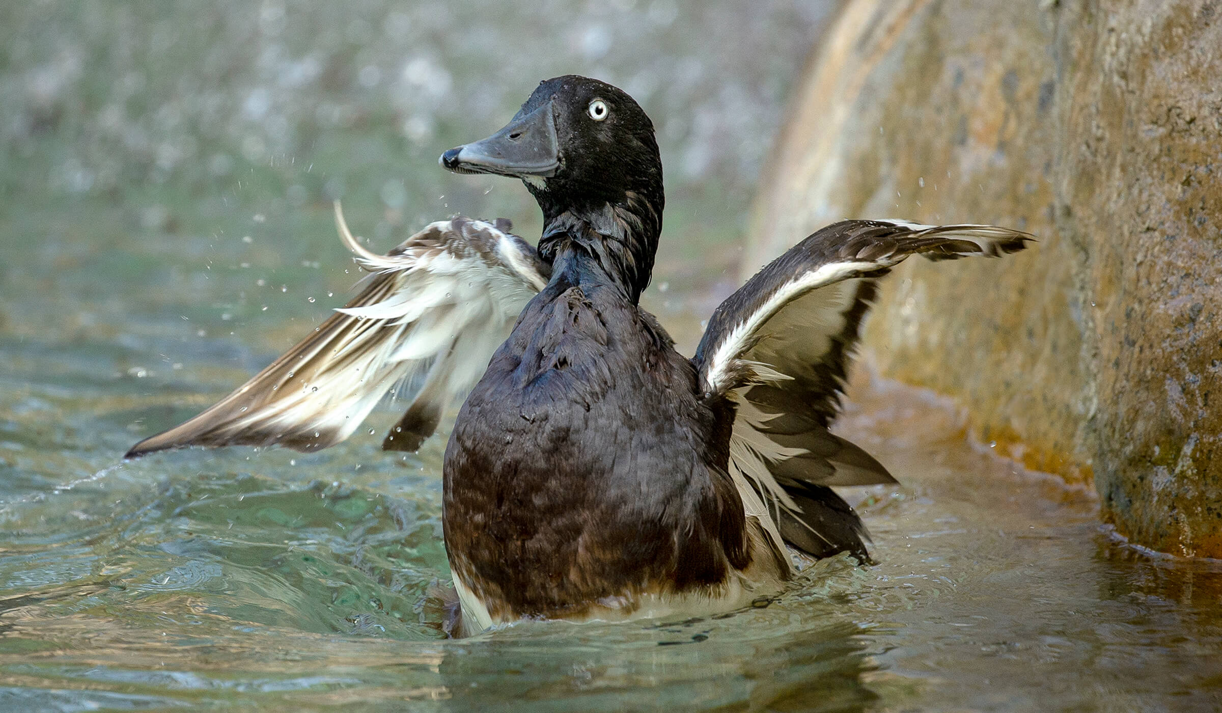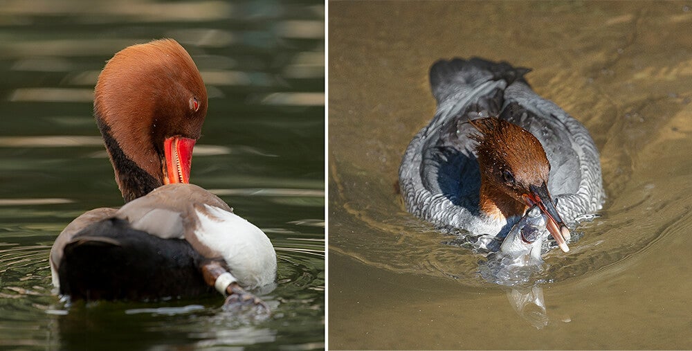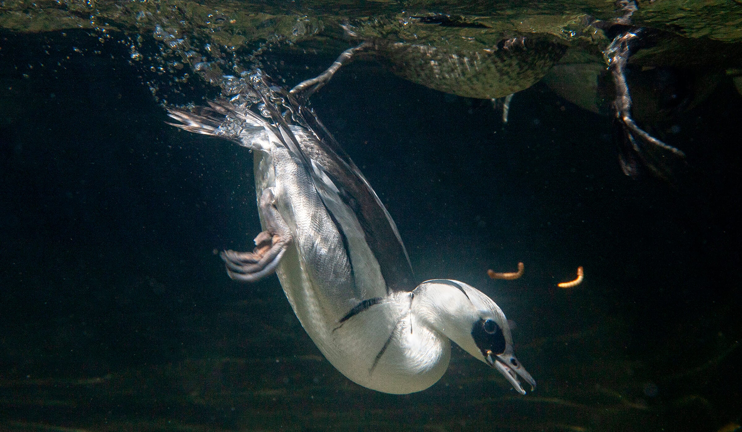 Behaviors guests might see when watching ducks at the Zoo or the Safari Park include preening feathers (like the red-crested pochard at left is doing), and catching fish, like the scaly sided merganser at right.[/caption] Diving ducks have a more compact body, with legs positioned closer to their rear end and the tail closer to the water’s surface. When this type of duck dives, it closes its wings tightly to squeeze out air between its feathers and decrease its buoyancy. Diving ducks use their feet to maintain a hovering position in the water or to push forward when diving. They typically stay under for 10 to 30 seconds, but some may stay submerged for a minute or more to grab an underwater snack.