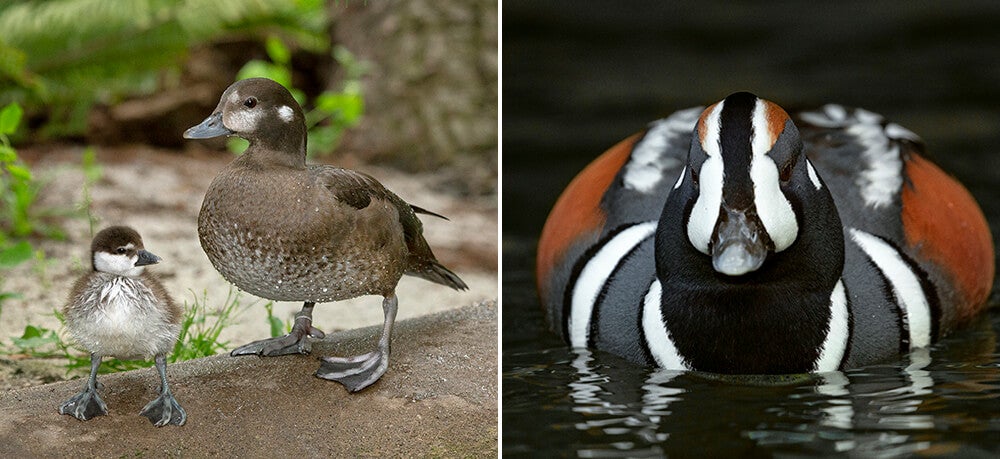 DESIGN FOR DABBLINGDabbling ducks, like the harlequin duck mother and duckling at left and the male at right, have oval-shaped bodies with feet positioned in the center, to help them float on the water’s surface and move easily across a waterway. On land, that shape and leg position makes them walk with a waddle.[/caption] Dabbling ducks have elongated, oval-shaped bodies, with feet positioned at the center to help them float gracefully across a pond, and take off in flight from the water without requiring a running start. However, that body shape makes them look much less graceful on land, and gives them their characteristic waddle. [caption id="attachment_135315" align="aligncenter" width="1000"]