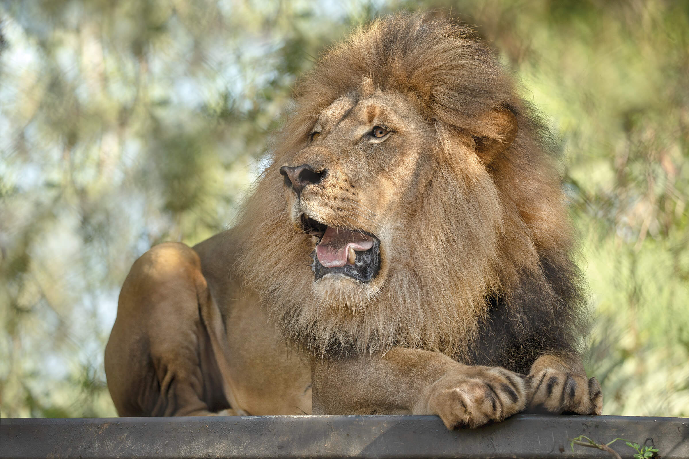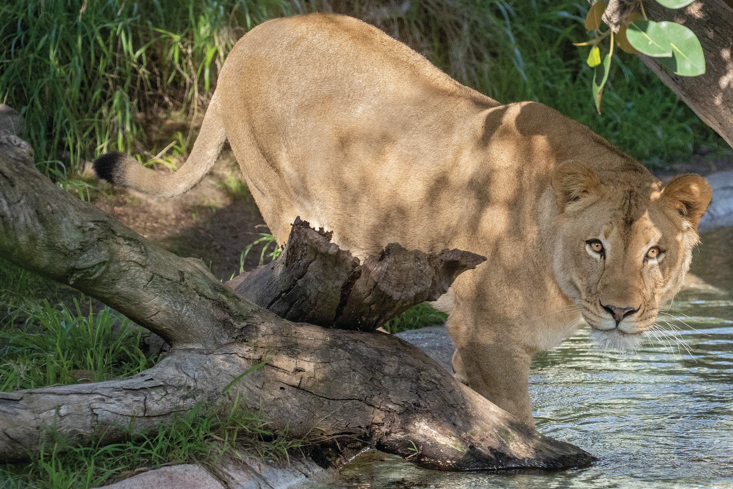 NEW EXPERIENCESAfter moving from the Safari Park to the Zoo, Ernest (pictured here) became very interested in watching the nearby elephants, and Miss Ellen (pictured above) enjoys catching fish.[/caption] Ernest and Miss Ellen have different types of structures to climb on in their Zoo habitat, such as the elevated platform where Ernest now often reclines. “It took Ernest a while to get used to climbing,” Pete said. Ernest was also a little shaky when he first attempted to reach large food items like cow femurs, which keepers sometimes hang from a post as enrichment. “Now, he’s getting a lot more confident.” Keepers are currently coming up with designs for a new climbing structure to take advantage of the vertical space, to further encourage the lions’ climbing behavior, Pete said. Funding for the project will be provided by donors and grant programs.