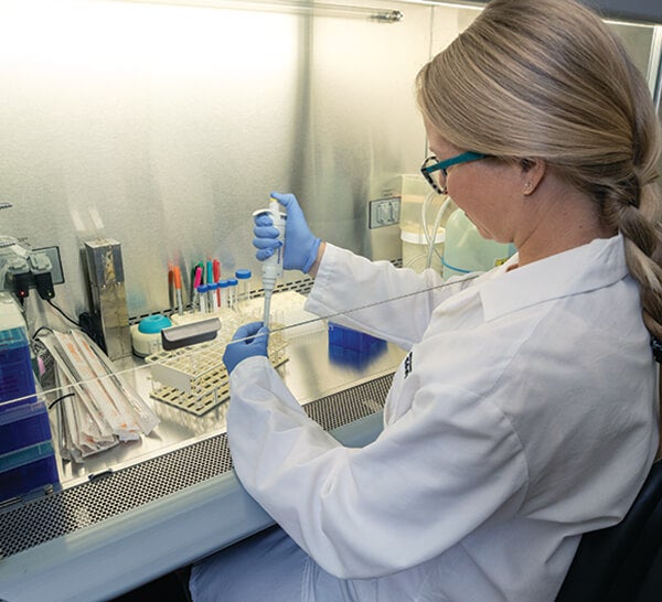 INTENSIVE CELL TREATMENTRachel Felton prepares to treat cells with suspected endocrine disrupting chemicals (EDCs).[/caption] Each of our projects, for the most part, resides in the laboratory. Surrounded by test tubes, cells growing in culture, and pipettors, we isolate the genes that encode the hormone receptors from small tissue samples collected from the species we study. We then place those genes inside cells that make the actual receptor proteins. Once the receptor proteins are made by the cells, we treat them with suspected EDCs and measure the interaction between the two, which gives us a clue about their potential to cause reproductive harm. It may seem far-fetched to think that what we measure in test tubes in the lab can predict how an EDC might affect a complex, living organism. However, we have successfully employed this approach to study the effects of EDCs on a number of species. [caption id="attachment_137188" align="aligncenter" width="2000"]