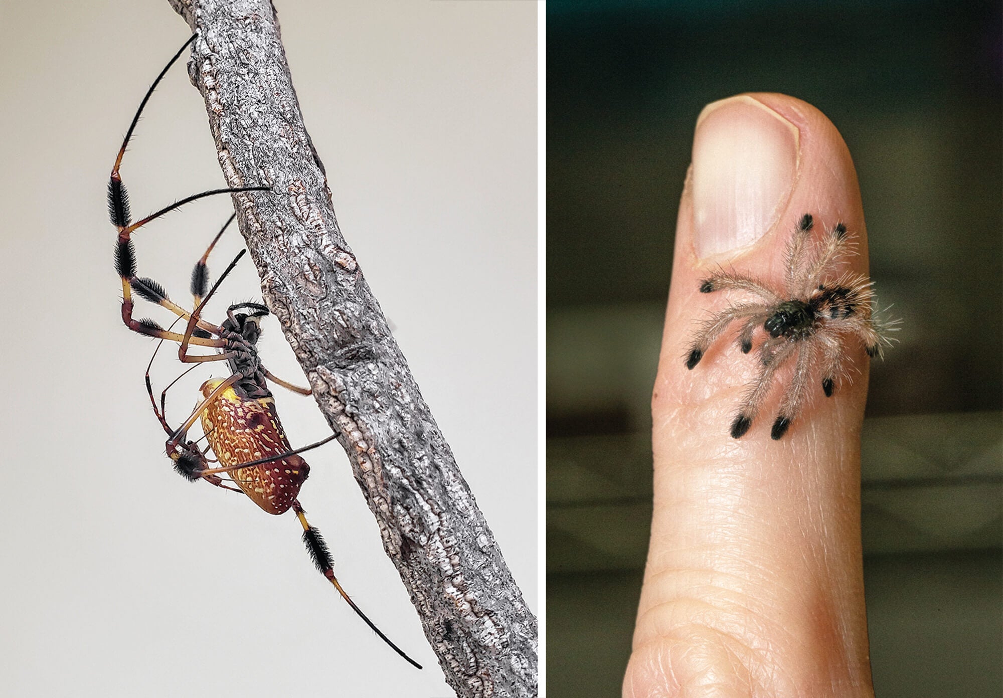 (Left) An adult male golden orb weaver gets a ride on an adult female. Females are much larger than males. (Right) Pink-toed tarantulas Avicularia avicularia have black toes when they hatch.[/caption]