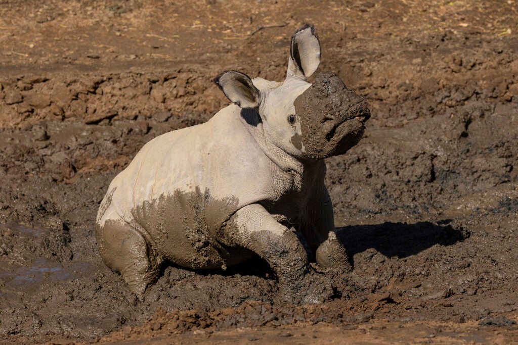 Just 9 days after he was born, Neville weighed a whopping 148.5 pounds. He’s gaining 3 to 4 pounds a day on average, and will gain about 100 pounds a month in his first year! And his confidence is following a similar growth trajectory. When he’s not busy stealing our hearts, he’s charging after his mom wanting to play, wallowing in the mud, and doing all the things we hope to see a young rhino doing. At his smaller size, Neville can run circles around his mom—think rhino zoomies! With his abundance of energy and curiosity, there’s no doubt that Neville will be keeping Livia and our wildlife care specialists on their toes.