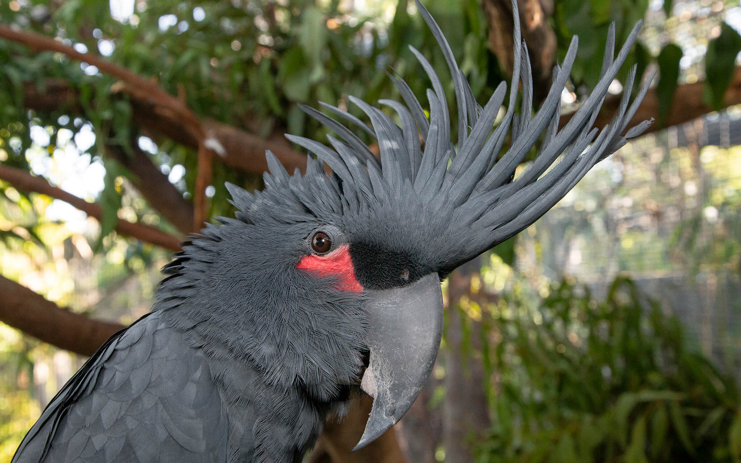 Among the frequently flashy-hued birds that make up the parrot group, the palm cockatoo Probosciger aterrimus stands out by virtue of its somber coloring. These “tall, dark, and handsome” birds have a home in the Zoo’s Conrad Prebys Australian Outback, and they are really a sight to see!