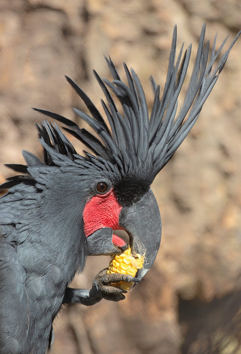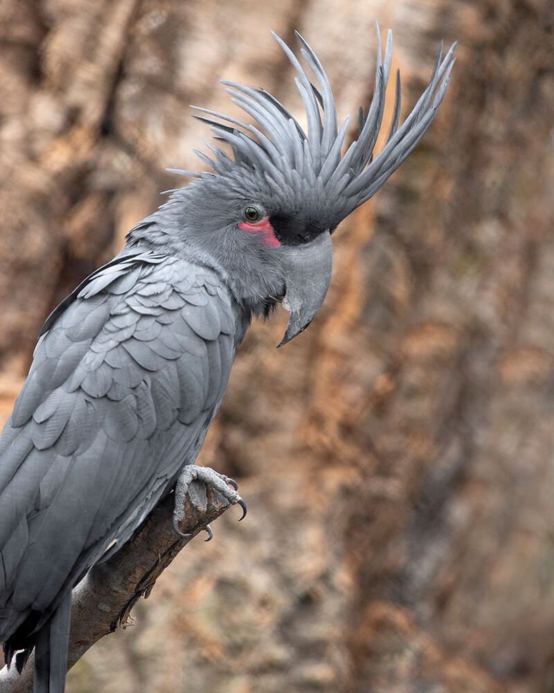 Native to northern Queensland, Australia, and New Guinea, this species is the largest of all cockatoos (measuring up to 25 inches from head to tail) and they also have the largest beak among their kind. A fine, white powder from exfoliated down feathers covers their body, making the black plumage appear dusky gray. The “bright spot” on a palm cockatoo’s face is the featherless patch of red skin under its ebony eyes. When the bird is excited, the spot flushes from dark pink to orange-red to scarlet in color. With their big beak, these birds are able to crack the large, tough nut of the pandanus plant (often called a palm, but it's not). Pandanus fruit is a palm cockatoo favorite. In fact, the birds’ common name comes from the fact they they are so often seen feeding in those trees (which, again, are not actually palms, but oh, well). They round out their diet with other types of fruits, nuts, and leaf buds. [caption id="attachment_137711" align="aligncenter" width="800"]