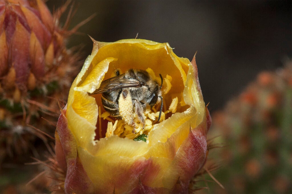 A digger bee gathers nectar and pollen from a cactus flower.