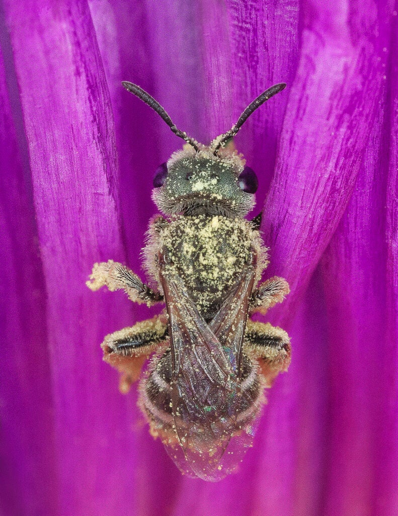 The next time you see a bee in a flower, look at their hind legs, and you may notice a large round patch of yellow that hides a cluster of stiff hairs. These are corbiculae, often called “pollen baskets” or “pollen pants,” which serve as storage vessels for foraging bees. Once covered in pollen, some bees actively comb it into the corbiculae with their legs. Other bees, like leafcutter and mason bees, carry pollen on the underside of their abdomen. Identifying the type of “pollen packing” structures present on a bee can be a key identification feature in the wild.