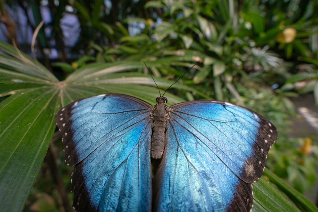 Additionally, the Spineless Marvels habitat in Wildlife Explorers Basecamp at the Zoo is another excellent pollinator destination. Brilliant blue morpho butterflies fly year-round in the greenhouse, and guests can witness them transforming into butterflies in the emergence chamber. The top floor of Spineless Marvels also offers a glimpse into the life cycle of other pollinators such as honey bees, monarchs, and giant flower beetles, with larger-than-life honeycombs and an immersive migration flyover. Through the observation window upstairs, you may find wildlife care specialists working with beetles, katydids, tarantulas, and other fascinating invertebrates, or preparing exotic butterfly pupae for their metamorphosis into adults.