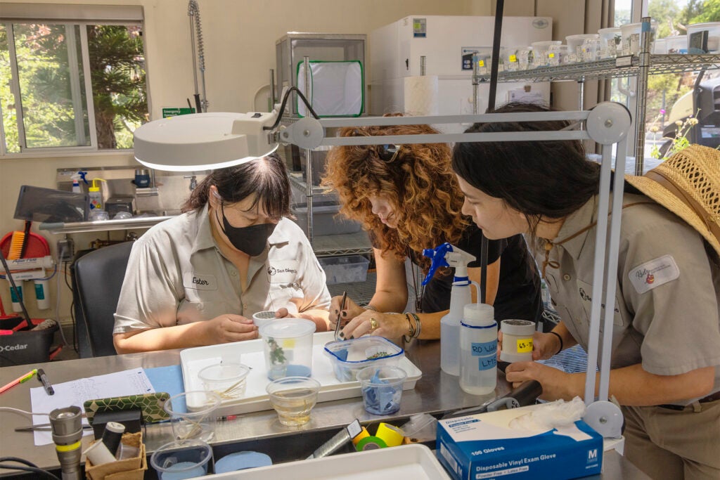 Entomology team members check endangered Laguna Mountains skipper butterfly pupae reared at the Butterfly Conservation Lab to prepare them for release into their native range.