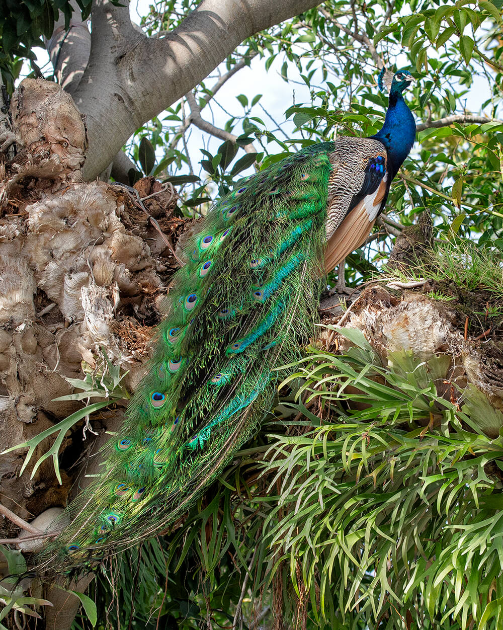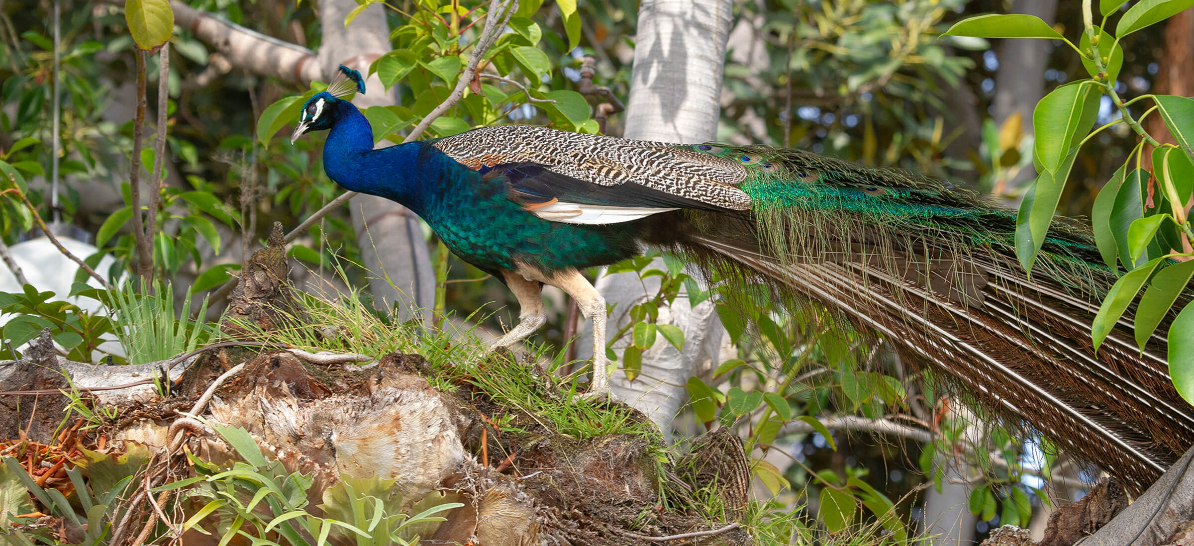 The loud, proud, and colorful peafowl flock has returned to the Zoo, after a two-year hiatus. They had been moved to an off-view area to keep them safe after a case of virulent Newcastle disease (VND) was discovered in Southern California in 2018. This contagious disease can affect both domestic poultry and wild birds in the order Galliformes (including peafowl and pheasants), and it can be spread from one area to another on people’s shoes, if they have been in an area where infected birds live—including backyards with chickens. Fortunately, new cases have not occurred for several months, and the VND quarantine was lifted in June of this year, allowing peafowl to once again roam freely throughout the Zoo. [youtube video=ttps://youtu.be/rBNOJzprH-c ] They may be better known for their strutting, but peafowl can fly, and they are among the largest birds that can do so. But they rarely fly long distances—mostly just from the ground to a high tree branch at night and back to the ground again in the morning. While the Zoo’s peafowl wander throughout the Zoo during the day and roost in the trees at night, instances of them venturing off Zoo grounds are extremely rare. While the Zoo occasionally gets a call reporting a peacock on the loose, the bird in question usually turns out to be a non-Zoo bird from a San Diego County backyard or farm, Dave said. [caption id="attachment_136854" align="aligncenter" width="1000"]