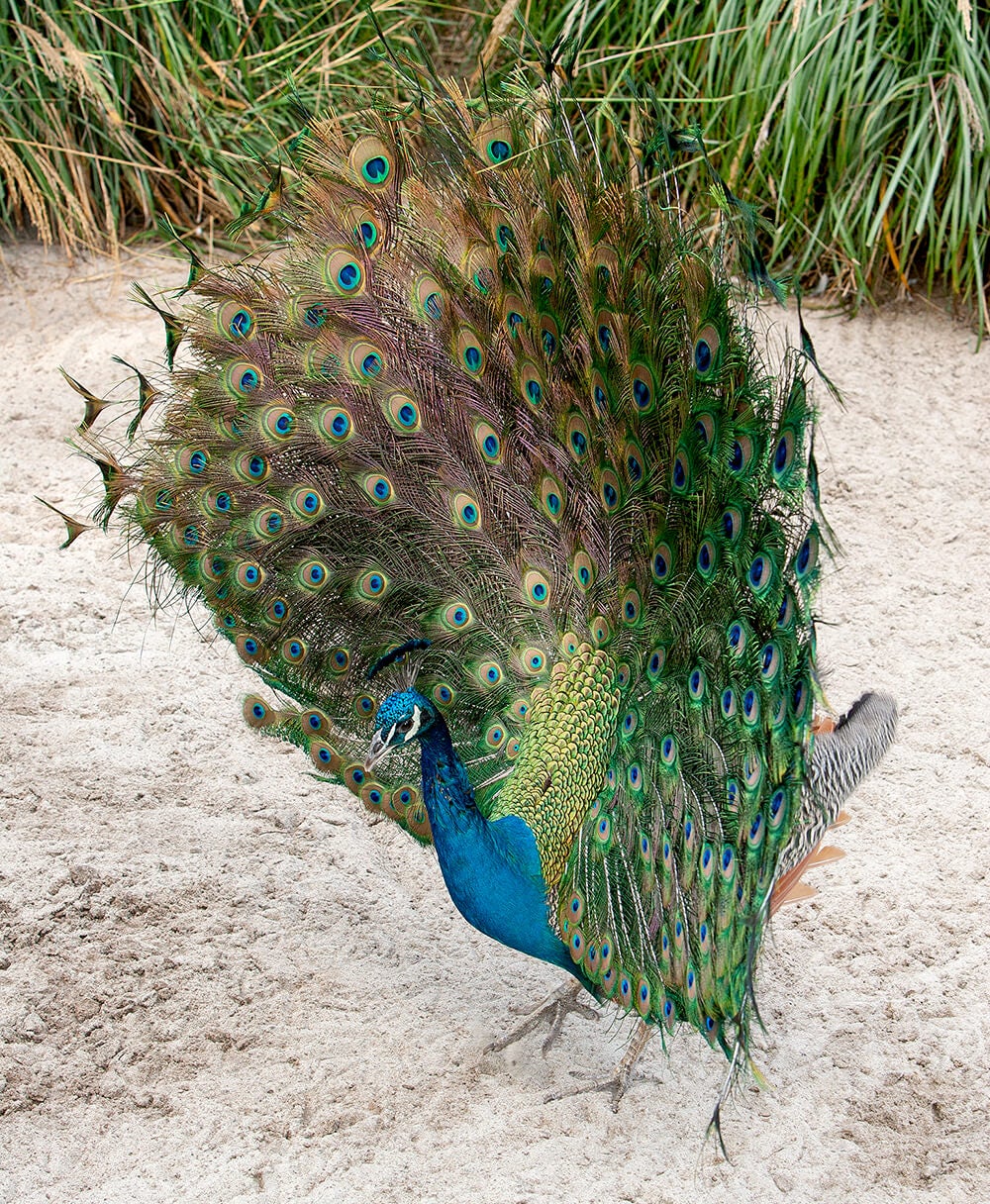 LONG TRAINWhile most people are familiar with the image of a peacock in full display (as at top), that’s not their usual look. More often, their colorful covert feathers are relaxed, draping down from the peacock’s back like the train of a wedding gown.[/caption] A train of long feathers—the peacock’s tail coverts—cover shorter, stiffer feathers at the base of the tail that are used to raise the coverts when it’s time for the peacock to “make a statement.” Most of the time, the colorful coverts drape from the peacock’s back to the ground, like the train of formal gown. But when a male raises his train to court a peahen or show dominance to another peacock, that showy, fan-shaped display of long feathers—studded with eye-shaped spots, called ocelli—can be up to seven feet wide. If, for some reason, a peacock doesn’t catch your eye, he will make his presence known in other ways. “You’ll definitely hear them,” Dave said. Peacocks are known for loud, raucous calls that carry for long distances. They sound off early in the day, late in the evening, and nearly all day long when breeding season rolls around.