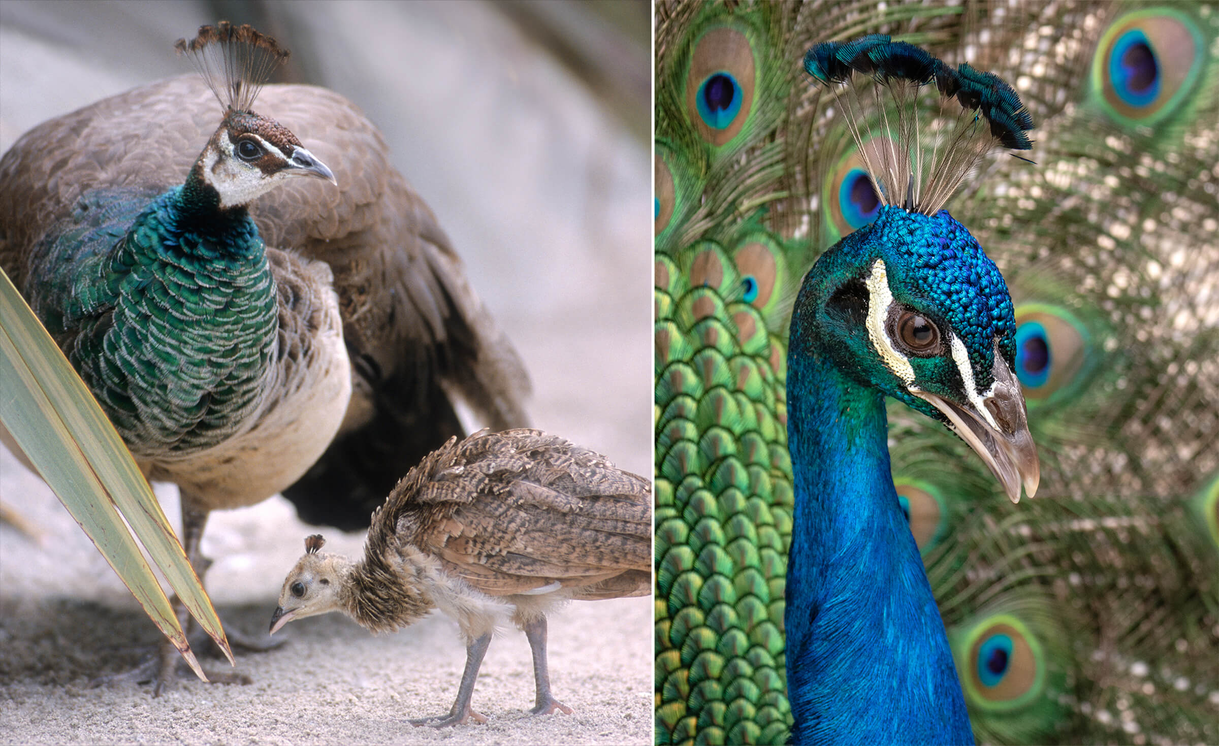 Many people refer to all Indian peafowl as “peacocks,” but that word really only describes the male of the species (right). The female (left) is a “peahen” and young peafowl are called “peachicks.”[/caption]