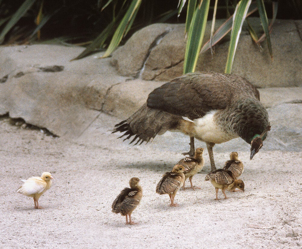 MUTED TONESAlthough male Indian peafowl have distinctive bright blue and green coloration, females have mostly brown plumage, which helps them blend in with their surroundings when they are nesting and raising chicks.[/caption] As in other lek species, peafowl are polygamous. A male may mate with several females in a season. After mating, the female lays three to eight eggs in a ground nest, incubates the eggs, and raises the chicks. At the Zoo, females and males are sometimes kept apart during breeding season, in order to maintain a healthy on-grounds population of 10 to 12 birds. “Every few years, females raise chicks on grounds,” Dave said. “But if every female bred, we would triple the population in one year.” Peacocks and peahens at the Zoo are once again offering guests a lot to see—and hear. “Peacocks are very much a part of the San Diego Zoo experience,” Dave said. “It’s great to have them back.” [caption id="attachment_136858" align="aligncenter" width="2400"]