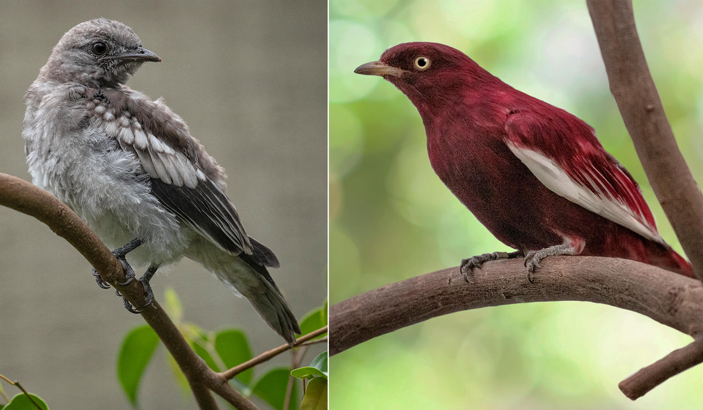 A NOTABLE HATCHAnimal care specialists at the Zoo’s off-exhibit Avian Propagation Center were thrilled this spring when a pair of pompadour cotingas hatched and raised a chick. It was a first for the species at the Zoo, and we’re all looking forward to seeing the little one (left) achieve its stunning adult color (right).[/caption]