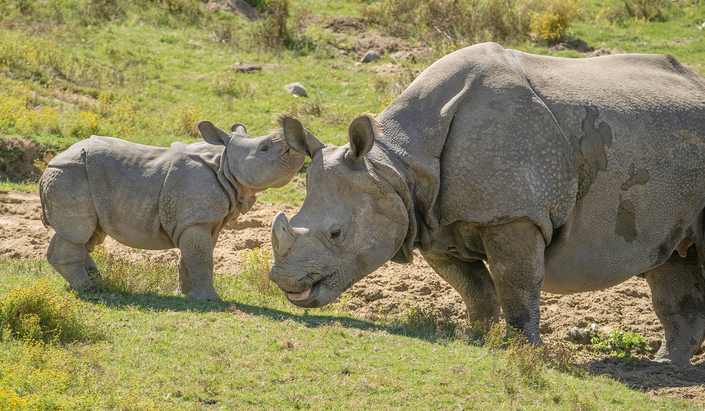 In the Asian field habitat at the Safari Park, our greater one-horned rhino population grew by two. Mother rhinos Asha and Tanaya gave birth to their calves just over two weeks apart, on March 25 and April 11, respectively. Both mom-and-calf pairs enjoyed plenty of private time for bonding in separate housing areas. [caption id="attachment_136778" align="aligncenter" width="1400"]