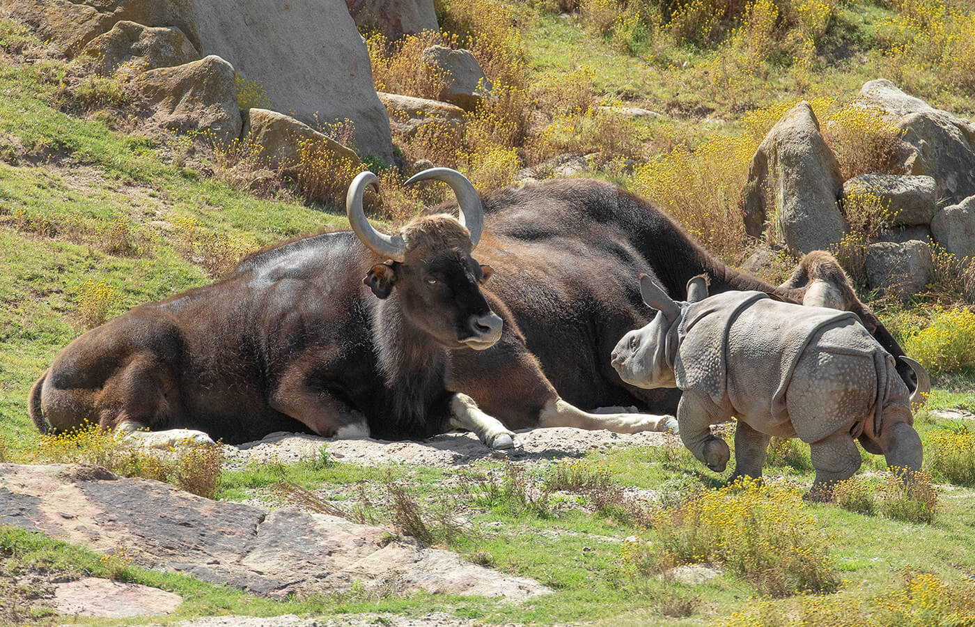 HOWDY, NEIGHBOROnce he got the feel of the habitat, Arjun began checking out the neighbors, like this pair of Indian gaur.[/caption] On May 20, 2020, habitat gates were opened, and as animal care specialists carefully observed, the littlest rhinos ventured out with their mothers into a 40-acre habitat. Tanaya and her female calf stepped out first. Together, they made use of a mud wallow, then headed out to explore the rest of the area. Not far behind them, Asha led her male calf, Arjun, farther onto the savanna, exploring the grassy hills. With curiosity fueling a bit of boldness, he ventured several feet away from Asha. But when he came face to face with one of his new neighbors, a Javan bantang, he quickly returned to his mother’s side.