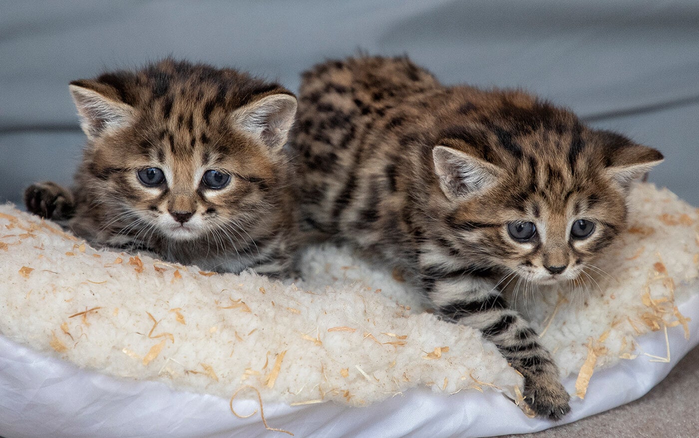 On April 28, 2020, the staff of our Carnivore Breeding Center near the Safari Park watched in wonder as Arwen, a black-footed cat, gave birth. “She started showing signs of labor around noon,” said Dion Rice, senior wildlife care specialist. “The first kitten, a male, was born about an hour after that—and after another hour, Arwen delivered a little female.” Cameras in the den and the yard give the staff a chance to marvel at Arwen’s mothering skills. [caption id="attachment_136780" align="aligncenter" width="1400"]