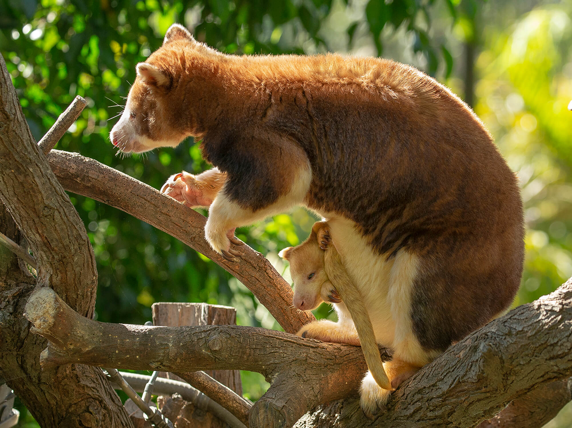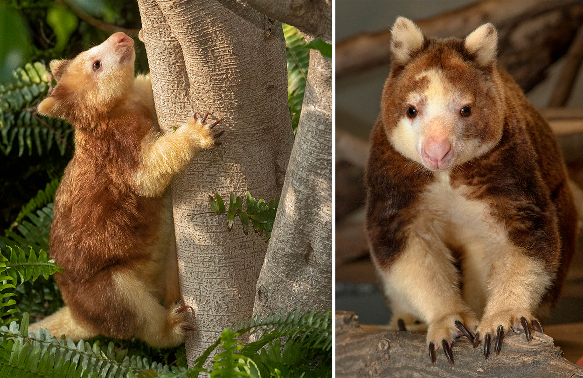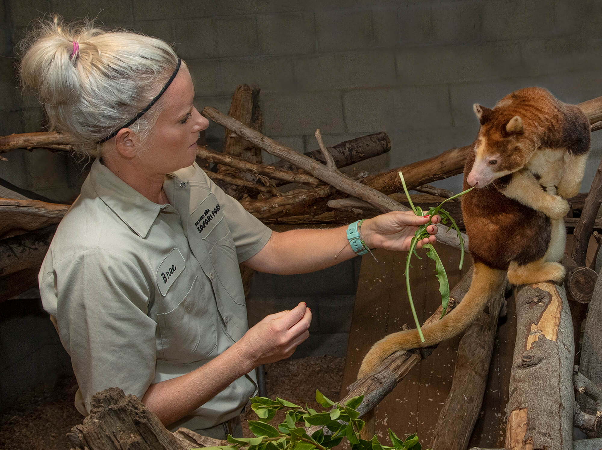 Three-year-old Polly tends to be a bit of an introvert, according to Safari Park mammal keeper Breanne Barney. “She’s shy, but she can also be curious and playful, on her own terms,” says Breanne. “I scratch her back, and she loves it—she leans into it. She has a good relationship with her keepers.” But that trusting relationship between keepers and the Matschie’s tree kangaroo didn’t happen overnight. [youtube video=ttps://youtu.be/GxTYojERslg] “The biggest challenge, when working with a marsupial, is getting them comfortable with us being tactile with them,” says Breanne. She points out that tactile work is something that many animals learn to appreciate. “You see keepers using deck brushes to rub down tapirs, rhinos, and elephants. Such tactile work opens the door for so many more things that help us care for them. We can do blood draws, trim their toenails, eye exams, mouth exams—even finding things like cysts or lesions on their skin.” In fact, keepers have a more hands-on relationship with the tree kangaroos than with many other species, ensuring that they are calm and relaxed as keepers examine parts of their body, including—for females—the pouch. [caption id="attachment_133996" align="aligncenter" width="2000"]