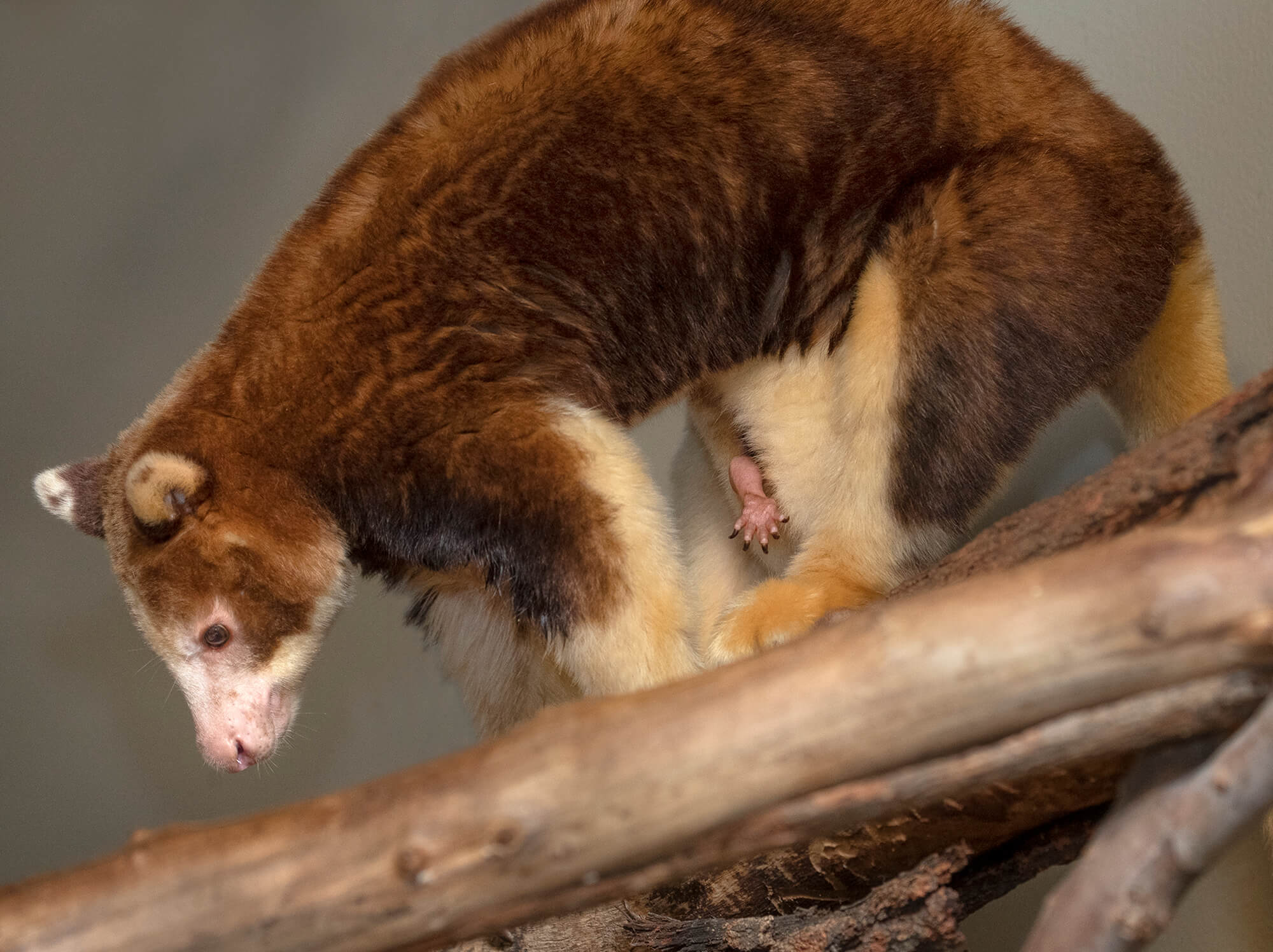 Long, sharp claws help a tree kangaroo climb in trees. Small, knobby projections—similar to those on the face of a ping-pong paddle—add grip to its palms and soles. Compared to ground-dwelling kangaroos, tree kangaroos have shorter hind legs; sturdier forelegs; and shorter, broader feet—adaptations that suit their arboreal lifestyle.[/caption] The SSP matched Polly with Spike, a male tree kangaroo Breanne describes as “more of an extrovert.” The first day they introduced the pair, keepers were encouraged to see the beginnings of courtship behavior. The next day, Polly and Spike moved past the getting-to-know-you stage, and keepers reported breeding behavior characteristic for the species. “For the next few days, Polly was doing a lot more pouch and genital region grooming than usual, so we knew that something promising had probably happened.” The waiting began: gestation for tree kangaroos generally lasts about 45 days. [caption id="attachment_133998" align="aligncenter" width="2000"]