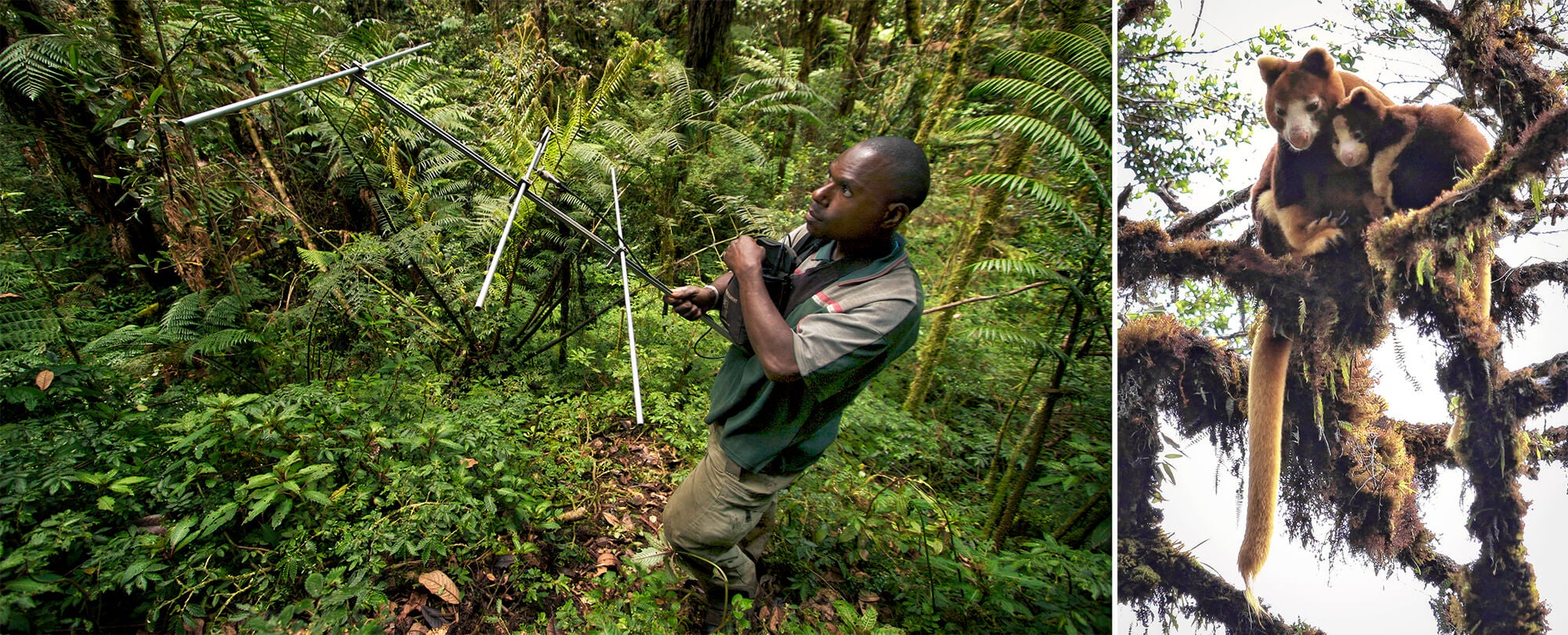 In Papua New Guinea, a Tree Kangaroo Conservation Program (TKCP) researcher tracks and monitors wildlife of the Huon Peninsula. All Matschie’s tree kangaroos live in a single population, in high elevations of the Huon Peninsula. The TKCP partners with local landowners to safeguard the species and other wildlife in the region. (Photos by: (Left) Tree Kangaroo Conservation Program, Woodland Park Zoo; (Right) Russ Mittermeier)[/caption] “Tree kangaroos are a priority species,” explains Breanne. “If you see them disappear, there are other species—like the orchids they eat, bees, birds, frogs, insects—that are disappearing, too. It’s a chain, and once a piece is gone, it falls apart. Getting that information out is vital.” She thinks tree kangaroos are uniquely able to help share that message. “They’re cute and fuzzy, and they look like stuffed animals”—something that encourages people to care about them and their survival.