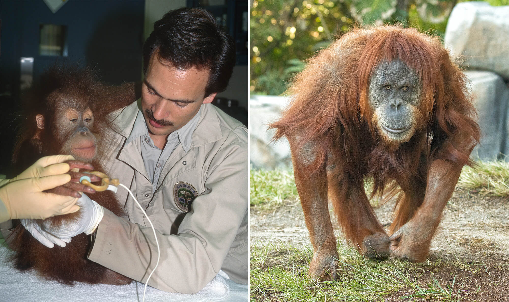 The only member of the orangutan group to be hand-raised at the San Diego Zoo as an infant, spunky Karen survived a widely publicized open-heart surgery in 1994, and she remains a guest favorite. She may be small, but she has a big personality. You might spot her rolling on the ground or twirling around the sway poles. The veterinary staff keep a close eye on Karen, and she gets a full cardiac workup with her routine, preventive maintenance exams. The 28-year-old is thriving. “Her heart is deemed perfect at every exam,” Tanya says. She advises guests to look for Karen playing on the ground or up in the hammocks. [caption id="attachment_138345" align="aligncenter" width="2400"]