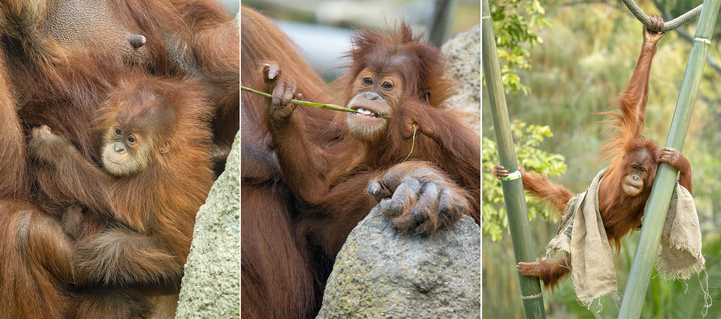 Female Indah may seem more aloof than the other orangutans, generally preferring the treetops and climbing structure to the ground. Lately, though, Tanya has observed her coming down and approaching the glass. The 34-year-old is the capable dam of Aisha as well as 17-year-old Cinta, a male who now resides at the St. Louis Zoo and is a sire himself. “Indah has grown more confident recently,” says Tanya. “She and Aisha make a nest every night, up in the climbing tree.” Orangutans have the slowest breeding rate of all mammals, bearing a single infant only every seven or eight years, and Indah is still nursing and mothering Aisha. [caption id="attachment_138346" align="aligncenter" width="2400"]
