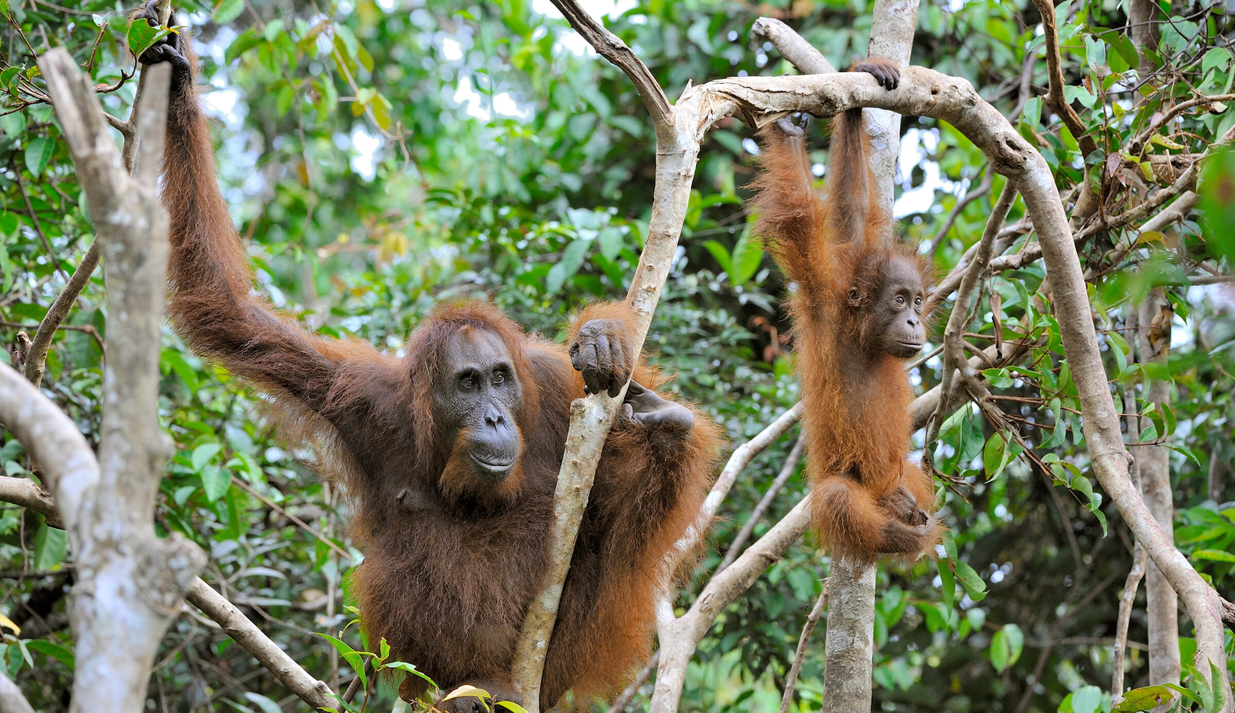 FOREST PEOPLEThe name orangutan means “people of the forest.” These apes live in tropical and swamp forests on the Southeast Asian islands of Borneo and Sumatra. They are the world’s largest arboreal mammal, and the only great apes in Asia—all other great ape species live in Africa. (Photo by Anup Shah/Getty Images)[/caption] Without predators like clouded leopards, Sumatran tigers, giant pythons, and crocodiles to avoid, orangutans at the Zoo are also quite comfortable on the ground. They spend time in and around rocky caves and man-made “termite mounds” that are often filled with tasty treats for the orangutans to retrieve. In Sumatra, orangutans ignore other primates, but at the Zoo, they often interact with the siamang family that shares their habitat. You might even get eye to eye with an orangutan that’s made itself at home up close to the habitat’s glass. And if you think they’re watching you, you could be right. They might want to show off their newest enrichment item, such as a burlap sack—or they might just want to watch you! [caption id="attachment_138342" align="aligncenter" width="1200"]