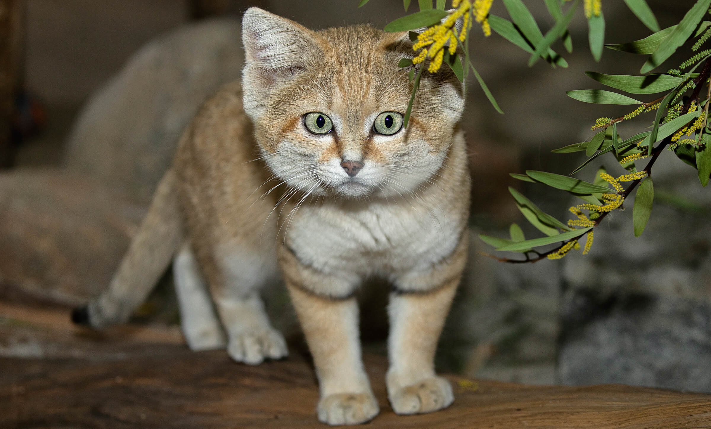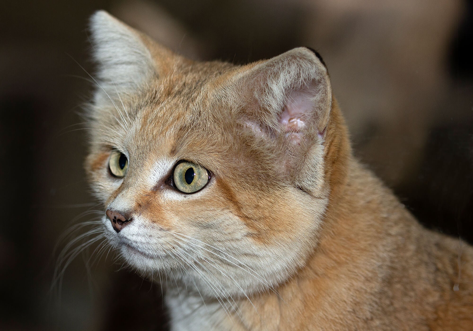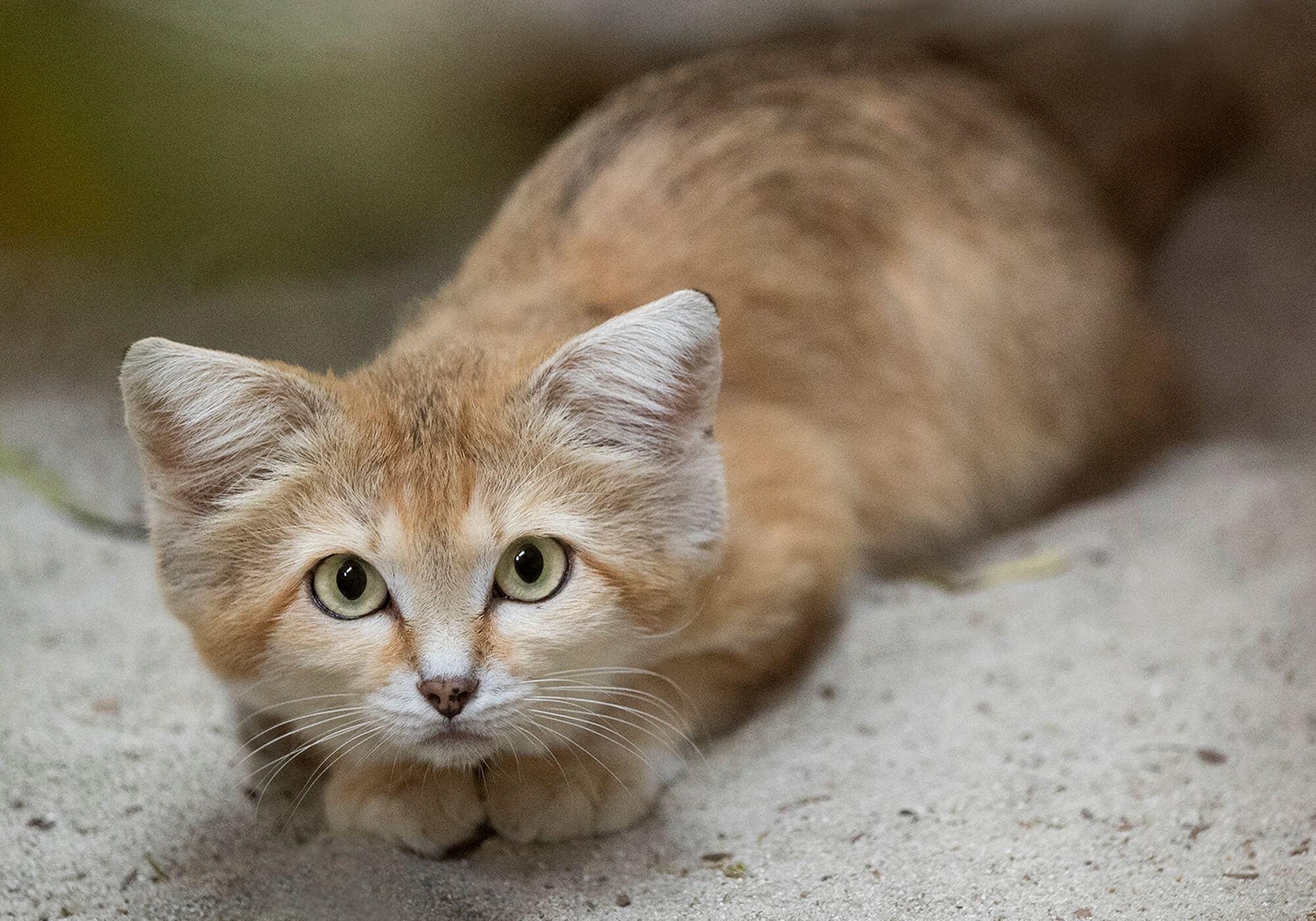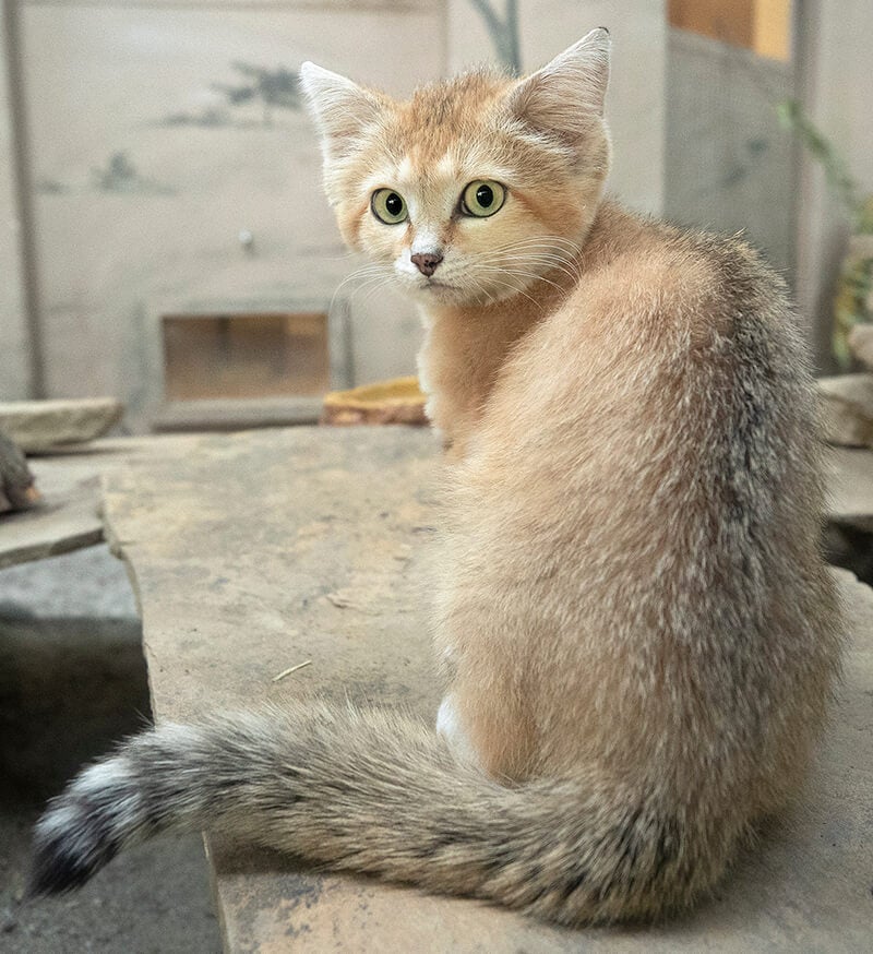 Wide-set ears (the better to hear from all directions) accentuate the broadness of a sand cat’s head, giving it its signature look.[/caption] Learning about the life of a sand cat in its desert habitat is rife with challenges. In addition to the extreme temperatures, these small cats prefer flat and rolling terrain, where their coloring provides perfect camouflage. Tracking sand cats is difficult. Fur on the soles of their feet (which provides traction on loose sand and protects against scorching surfaces) leaves less of a mark than a bare pad; their tracks are swept away as they are laid down. In places like the Safari Park, however, we’re able to get a closer look and learn more each day. “Newman communicates with us through hisses and purrs,” Danielle says. “But we have heard him meow—to another small cat species, a black-footed cat.” What that difference in vocalizations means is unknown, but observations like these are important nonetheless. Sand cats occur at extremely low densities throughout their range. They seem to have a patchy distribution, and due to concern that their population is declining in size, the International Union for Conservation of Nature categorizes them as Least Concerned." [caption id="attachment_136344" align="aligncenter" width="2400"]