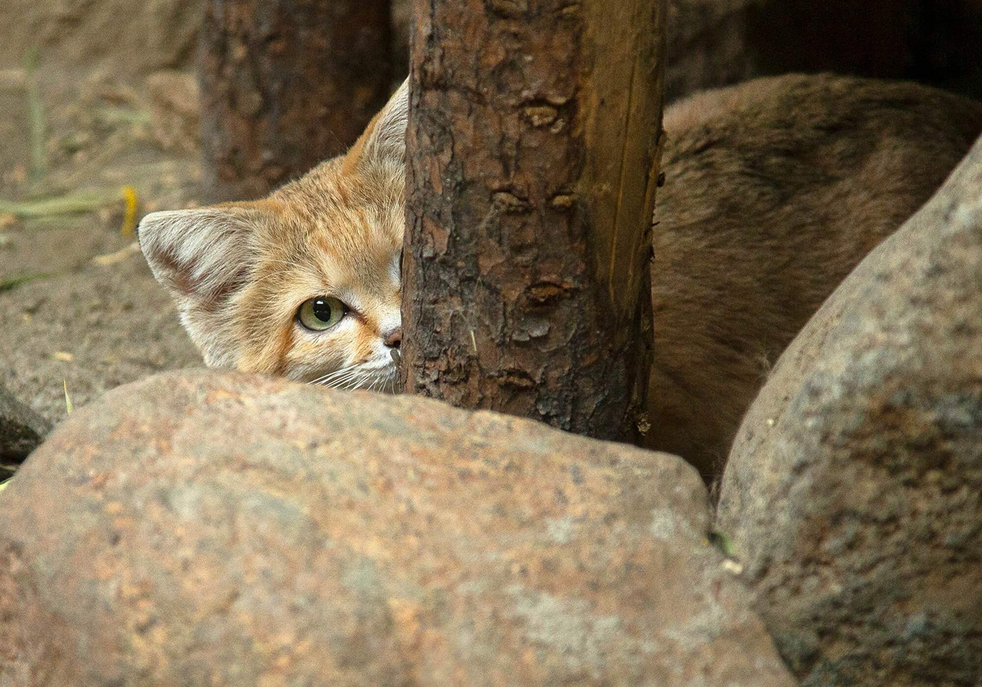 The sounds of the Safari Park’s Nairobi Village, where he lives, add another dimension to his home. Newman can hear what goes on in the staff area behind his habitat, as sand cats have extraordinary hearing. If you have ever had a domestic cat sharing your home, you understand how excellent their hearing is—and sand cats surpass that. On any cat, more than 20 muscles control each ear, and the ears can move independently; one can be pointed forward while the other is pointed back. Cat ears can quickly turn to catch sounds in all directions, including those behind the animal. They can hear the ultrasonic noises that small prey, like rodents, make, which are beyond our hearing range. The ears of a sand cat are even more specialized. Although the external ear size is about equal to a house cat’s, the inner ear canal is twice the size. Studies show that a sand cat’s hearing sensitivity is about eight decibels greater than domestic cats’ for frequencies below two kilohertz. (Loudness is measured in decibels, while pitch is measured in kilohertz; two kilohertz is very high pitched.) Thick hair protects the inner ear. [caption id="attachment_136342" align="aligncenter" width="2000"]
