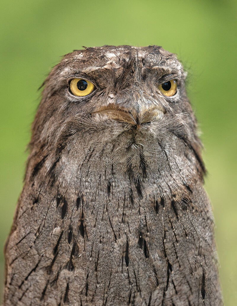 DON'T LOOK AWAYCliff, a tawny frogmouth. You may get a chance to meet nearly-30-year-old Cliff or his younger lookalike, Kermit, during one of the presentations at Walkabout Australia.[/caption] Next, we meet Cliff, an impressive bird that looks vaguely familiar, but proves difficult to identify. Some people on the tour suppose he’s an owl. Others suggest maybe he’s a hawk—until senior trainer Laura Spann calls our attention to the fact that Cliff has no talons for catching prey. It turns out that the owl-like bird is a tawny frogmouth—a common backyard bird in Australia that is, for the most part, an ambush predator. The inside of his mouth is bright yellow, and his tongue looks like the center of a flower. Laura points out his wide beak—responsible for the species’ common name. “He can sit in a tree, with his mouth wide open, and insects conveniently fly right in,” Laura says. [caption id="attachment_134167" align="aligncenter" width="800"]