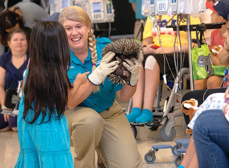 NICE TO MEET YOUTrainer Donna Kent introduces Chindi the echidna to a new friend at Children’s Hospital of Orange County. Hospital visits like this lift the spirits of the patients and their families, and give them a chance to meet and learn about animals.[/caption] In addition to providing in-Park presentations and behind-the-scenes safaris, the Wildlife Workshop team also introduces people to ambassador animals at special events and at television studios. “Ambassador animals like Chindi go with us go to children’s hospitals, local news stations, education assemblies—anywhere we can share the conservation message,” Samantha says. And that’s the whole point of the Wildlife Workshop program, says Travis. “Our mission is to inspire people to make a difference for wildlife and wild places, through fun, exciting, and life-changing experiences.” Of all the Wildlife Workshop programs, the one closest to staff members’ hearts is the grant- and donor-funded Safari Express, which takes ambassador animals to senior care facilities and at-risk youth centers. [caption id="attachment_134170" align="aligncenter" width="800"]