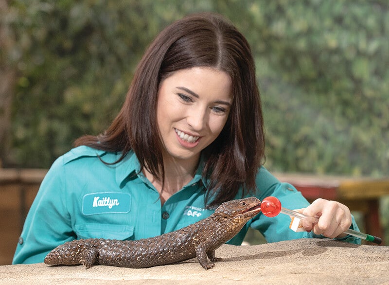 LEARNED LIZARDJack the shingleback skink surprises guests with his smarts; trainer Kaitlyn Downing has been teaching the Australian lizard to follow a colored target when he’s in the mood for guest interaction.[/caption] Exposure to animals like Steve, Chindi, and Cliff may especially benefit those who otherwise tend to isolate themselves. Care workers at senior facilities note that even residents who normally decline group activities come out of their rooms to see a Wildlife Workshop presentation and meet the animals. During one visit, a memory care, hospice patient attended the presentation. To the pleasant surprise of her family, the otherwise non-communicative woman spoke enthusiastically about the animals for a week. After she passed away, the family wrote a thank-you letter to the Wildlife Workshop team, to let them know how much joy it gave them to see their relative so happy and animated. San Diego Zoo Global is grateful for the individuals, corporations, and foundations that enable us to provide the Safari Express program to those in the community who may not be able to visit the Zoo or Park on their own.