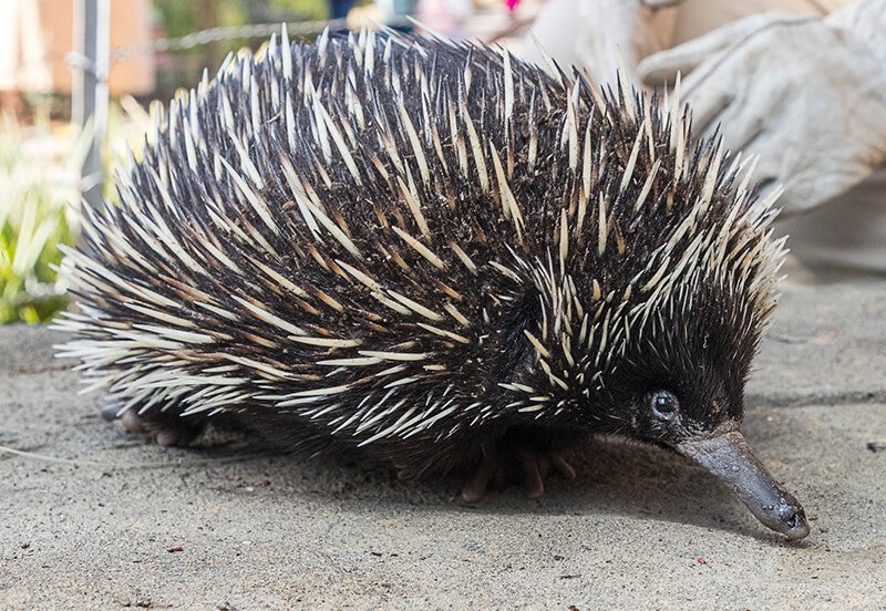 Short-beaked echidnas are one of very few mammals—called monotremes—that lay eggs. Chindi gives Safari Park visitor a close look at this unusual species.[/caption] The spiky animal that greets the tour next is named Chindi. He is a mammal—albeit an egg-laying one. The short-beaked echidna belongs to an unusual group of mammals known as the monotremes, which also includes three species of long-beaked echidnas (all found on the island of New Guinea), and Australia’s most mysterious mammal, the platypus. “Thankfully, short-beaked echidnas like Chindi aren’t endangered,” says Chindi’s trainer, Samantha Passovoy. “But their long-beaked relatives are.” In New Guinea, echidna habitat is destroyed when it is converted for agriculture, and while people in New Guinea have traditionally hunted echidnas for subsistence, firearms and the use of hunting dogs are making hunting a bigger threat now. One danger to all four echidna species is habitat fragmentation. Highways and roads crisscrossing echidna habitat are a physical hazard, and when suitable habitat becomes separated into chunks, different populations can’t meet up to breed, and genetic viability can suffer. [caption id="attachment_134168" align="aligncenter" width="800"]