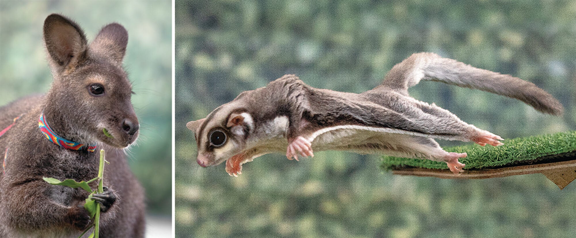 WALLA-BEA(Left) Bea, a red-necked wallaby. As a nine-month-old, Bea liked to snuggle into a cloth pouch worn by her trainer. Today, she greets guests on her own four—or sometimes two—unique feet. (Right) A sugar glider springs into the air. By spreading the loose skin that extends between their limbs, these little marsupials can glide through the Australian forest for 20 feet or more.[/caption] On a Roos and Mates tour, we make the acquaintance of an inquisitive (and adorable!) red-necked wallaby named Bea. Her reluctance to sit still gives senior trainer Donna Kent the opportunity to explain the unique way macropods (kangaroos and wallabies) walk. We watch as Bea leans forward to support her full weight on her impossibly tiny front limbs, then lifts both hind feet and pulls them forward at the same time. As Bea busily explores, nose aquiver, Donna hands us some pelleted wallaby food. It’s a thrill when Bea hops over, nuzzles us to take a few pellets, and allows us to softly stroke her thick fur. While populations of this species are stable, Donna tells us that habitat fragmentation, drought, and bushfires, like those that happened this past December and January, threaten many of Australia’s marsupials and other species. [caption id="attachment_134166" align="aligncenter" width="800"]