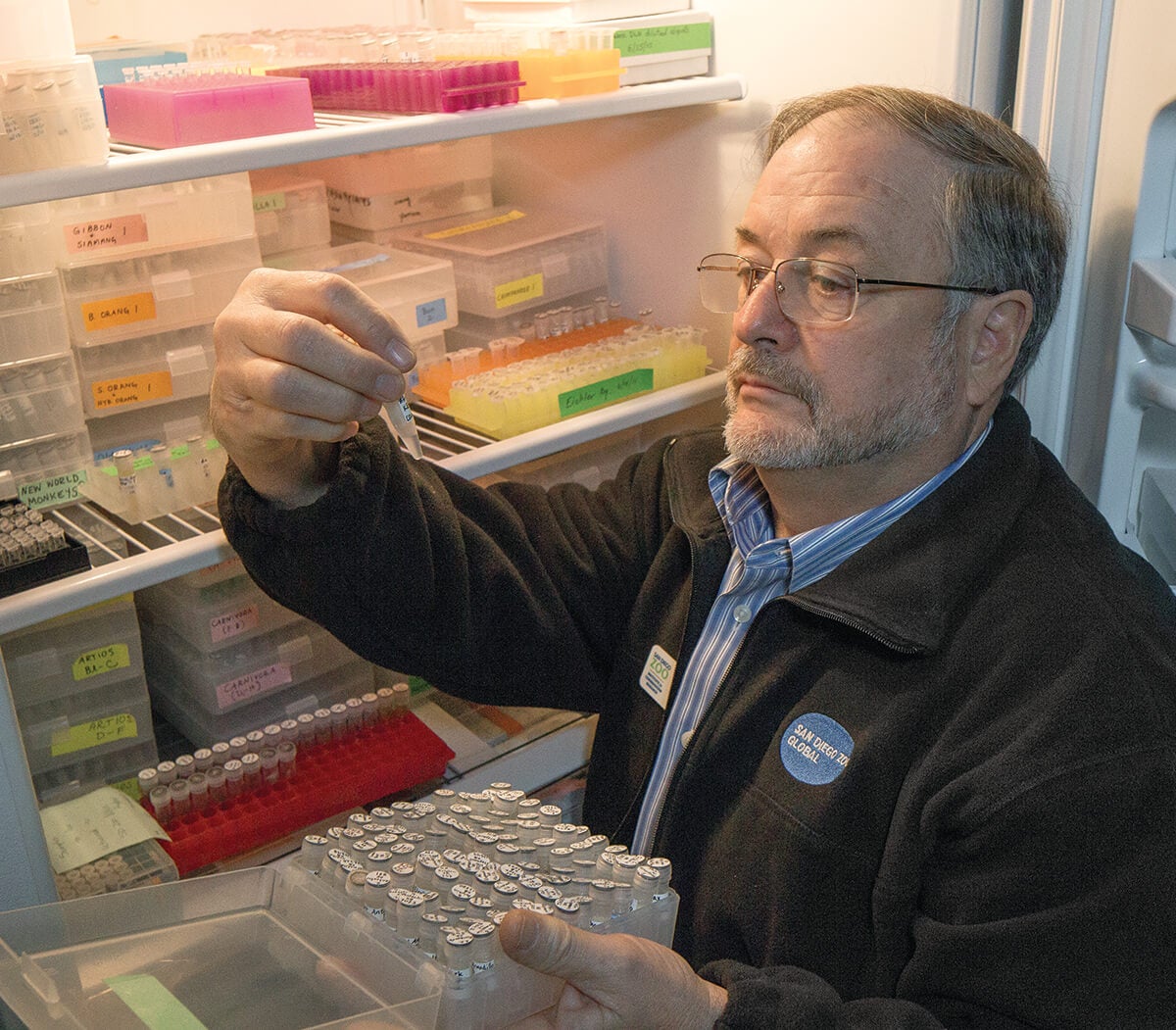 PRECIOUS CELLSOliver Ryder, Ph.D., Kleberg Endowed Director of Conservation Genetics at San Diego Zoo Global, examines DNA samples derived from northern white rhinoceros cells grown in the Frozen Zoo®. Conservation researchers are using samples for genomic studies and to facilitate crucial research for the northern white rhino genetic rescue initiative.[/caption] When I first learned about cells in school, I was amazed and wanted to know how it all worked. I am still amazed and still wondering to this day. Long ago now, I grew bacterial cells, initially for a science fair project, and then in my graduate studies. When I joined the conservation team at San Diego Zoo Global, I was excited to learn how to grow animal cells for the Frozen Zoo®, which was still in its infancy. Since then, conservation specialists have grown cells of literally thousands of animals of a multitude of species, and in doing so, learned a lot, honing their skills and bolstered by many important discoveries in the field. Proof of the capabilities of these cells in the Frozen Zoo came dramatically to the fore when the 1996 birth of Dolly, the cloned sheep, came to light. An entire animal had been produced from a single adult cell, going through all the stages of development from embryo to lamb. The world was astounded, and no one more than I. The potential of the Frozen Zoo had been forever changed. [caption id="attachment_137943" align="aligncenter" width="1024"]