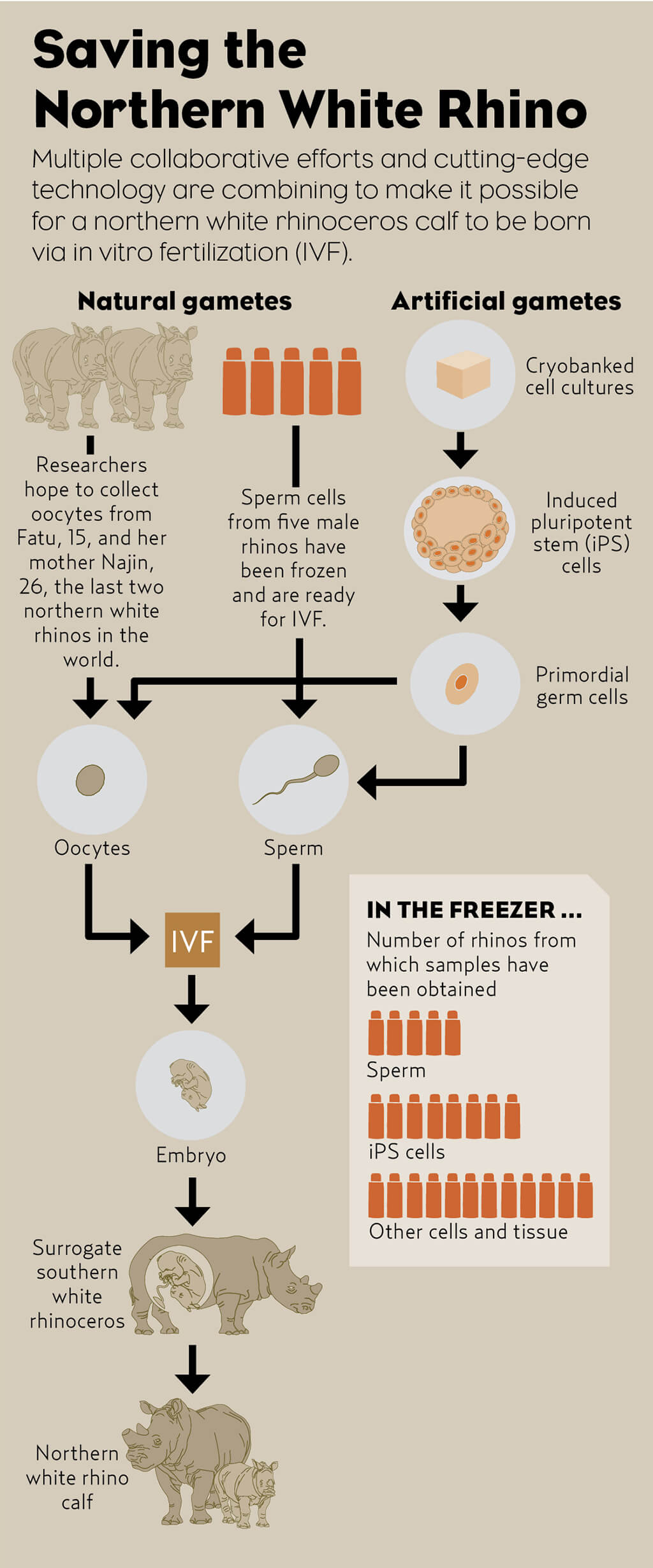 GONE BUT NOT FORGOTTENCell lines derived from northern white rhinoceros and longtime Safari Park resident Angalifu are among those banked in the Frozen Zoo.[/caption] Yet another amazing discovery expanded the potential even further. By triggering the action of a small number of master genes, adult cells derived from a skin sample, such as those cryobanked in the Frozen Zoo, can be reprogrammed—rebooted, if you will—in the laboratory, to produce stem cells that are capable of becoming all the cell types of the body. This capacity, called pluripotency, is a characteristic of every successful embryo of a multicellular organism. The discovery of the method to induce or reboot cells to become pluripotent is one of the most important developments in the history of biological research. [caption id="attachment_137940" align="aligncenter" width="2000"]