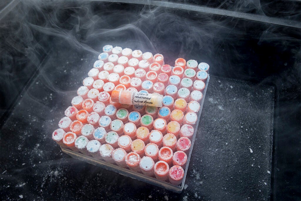 While only two northern white rhinos remain on Earth, hope for a new generation lives on in our Wildlife Biodiversity Bank. Here, 12 genetically diverse living cell lines are carefully cryopreserved in our Frozen Zoo®, promising a future for these critically endangered rhinos.